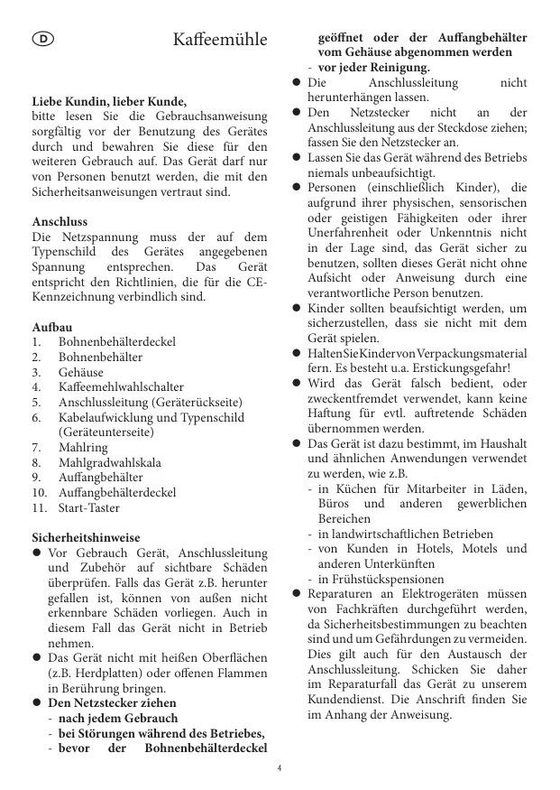 Sicherheitshinweise © Vor Gebrauch Gerät, Anschlussleitung und Zubehôr auf sichtbare Schäden überprüfen. Falls das Gerât z.B. herunter gefallen ist kônnen von aufen nicht erkennbare Schäden vorliegen. Auch in diesem Fall das Gerät nicht in Betrieb nehmen. Das Gerât nicht mit heifien Oberflächen (z.B. Herdplatten) oder offenen Flammen in Berührung bringen. ‘+ Den Netzstecker zichen - nach jedem Gebrauch - bei Stérungen während des Betriebes, - bevor der Bohnenbehälterdeckel geôffnet oder der Auffangbehälter vom Gehäuse abgenommen werden - vor jeder Reinigung. Die Anschlussleitung nicht herunterhängen lassen. Den Netstecker nicht an der Anschlussleitung aus der Steckdose ziehen; fassen Sie den Netzstecker an, Lassen Sie das Gerät während des Betriebs niemals unbeaufsichtigt Personen (einschlieflich Kinder), die aufgrund ihrer physischen, sensorischen oder geistigen Fähigkeiten oder ihrer Unerfahrenheit oder Unkenntnis nicht in der Lage sind, das Gerät sicher zu benutzen, sollten dieses Gerät nicht ohne Aufsicht oder Anweisung durch eine verantwortliche Person benutzen. Kinder sollten beaufsichtigt werden, um sicherzustellen, dass sie nicht mit dem Gerät spielen. HaltenSieKindervon Verpackungsmaterial fern. Es besteht u.a. Erstickungsgefahr! Wird das Gerät falsch bedient, oder zweckentfremdet verwendet, kann keine Haftung für evil. aufiretende Schäden übernommen werden. Das Gerät ist dazu bestimmt, im Haushalt und ähnlichen Anwendungen verwendet zu werden, wie z.B. - in Küchen für Mitarbeiter in Läden, Büros und anderen gewerblichen Bereichen - in landwirtschafilichen Betrieben - von Kunden in Hotels, Motels und anderen Unterkünfien = in Frühstückspensionen Reparaturen an Elektrogeräten müssen von Fachkräfien durchgeführt werden, da Sicherheitsbestimmungen zu beachten sind'und um Gefährdungen zu vermeiden. Dies gilt auch für den Austausch der Anschlussleitung. Schicken Sie daher im Reparaturfall das Gerät zu unserem Kundendienst. Die Anschrift finden Sie im Anhang der Anweisung,
