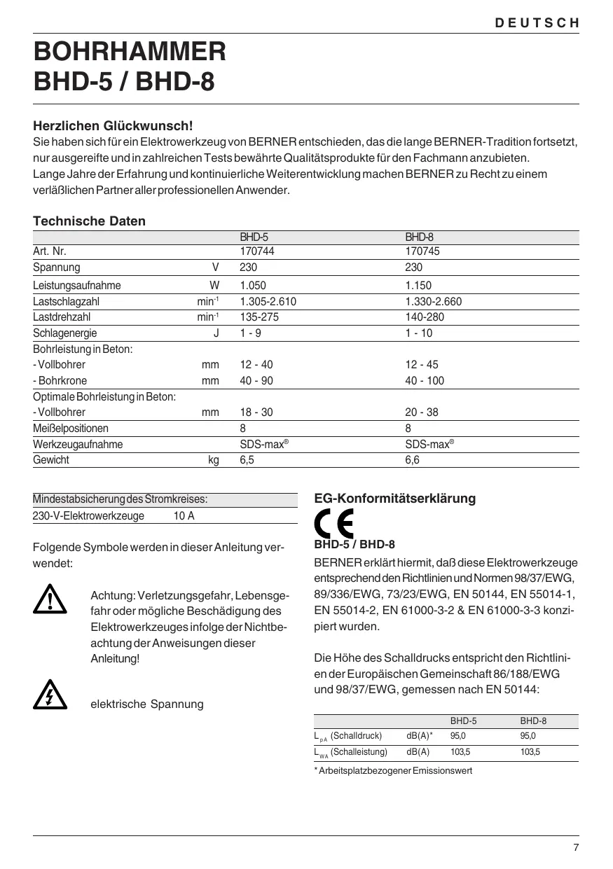 F DEUTSCH BOHRHAMMER BHD-5 / BHD-8 Herzlichen Glückwunsch! Sie haben sich für ein Elektrowerkzeug von BERNER entschieden, das die lange BERNER-Tradition fortsetzt, nur ausgereifte und in zahlreichen Tests bewährte Qualitätsprodukte für den Fachmann anzubieten. Lange Jahre der Erfahrung und kontinuierliche Weiterentwicklung machen BERNER zu Recht zu einem verläßlichen Partner aller professionellen Anwender.