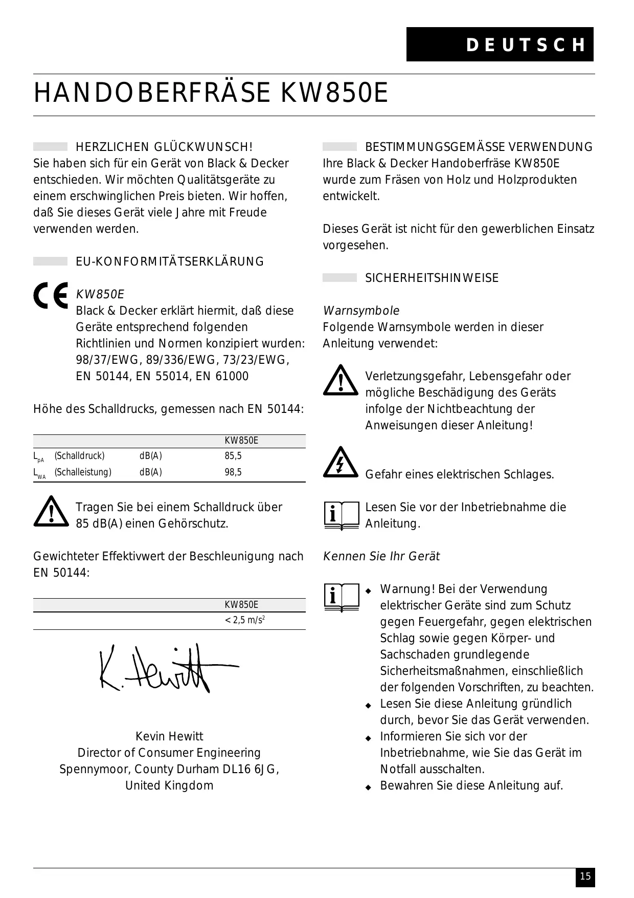 EU-KONFORMITÄTSERKLÄRUNG SICHERHEITSHINWEISE KW850E Black & Decker erklärt hiermit, daß diese Geräte entsprechend folgenden Richtlinien und Normen konzipiert wurden: 98/37/EWG, 89/336/EWG, 73/23/EWG, EN 50144, EN 55014, EN 61000 Höhe des Schalldrucks, gemessen nach EN 50144: