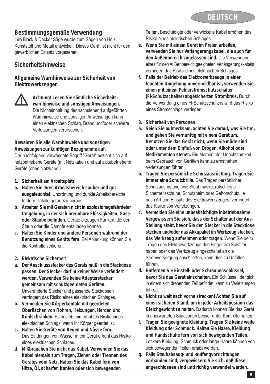 DEUTSCH Bestimmungsgemäße Verwendung Ihre Black & Decker Säge wurde zum Sägen von Holz, Kunststoff und Metall entwickelt. Dieses Gerät ist nicht für den gewerblichen Einsatz vorgesehen. Sicherheitshinweise Allgemeine Warnhinweise zur Sicherheit von Elektrowerkzeugen