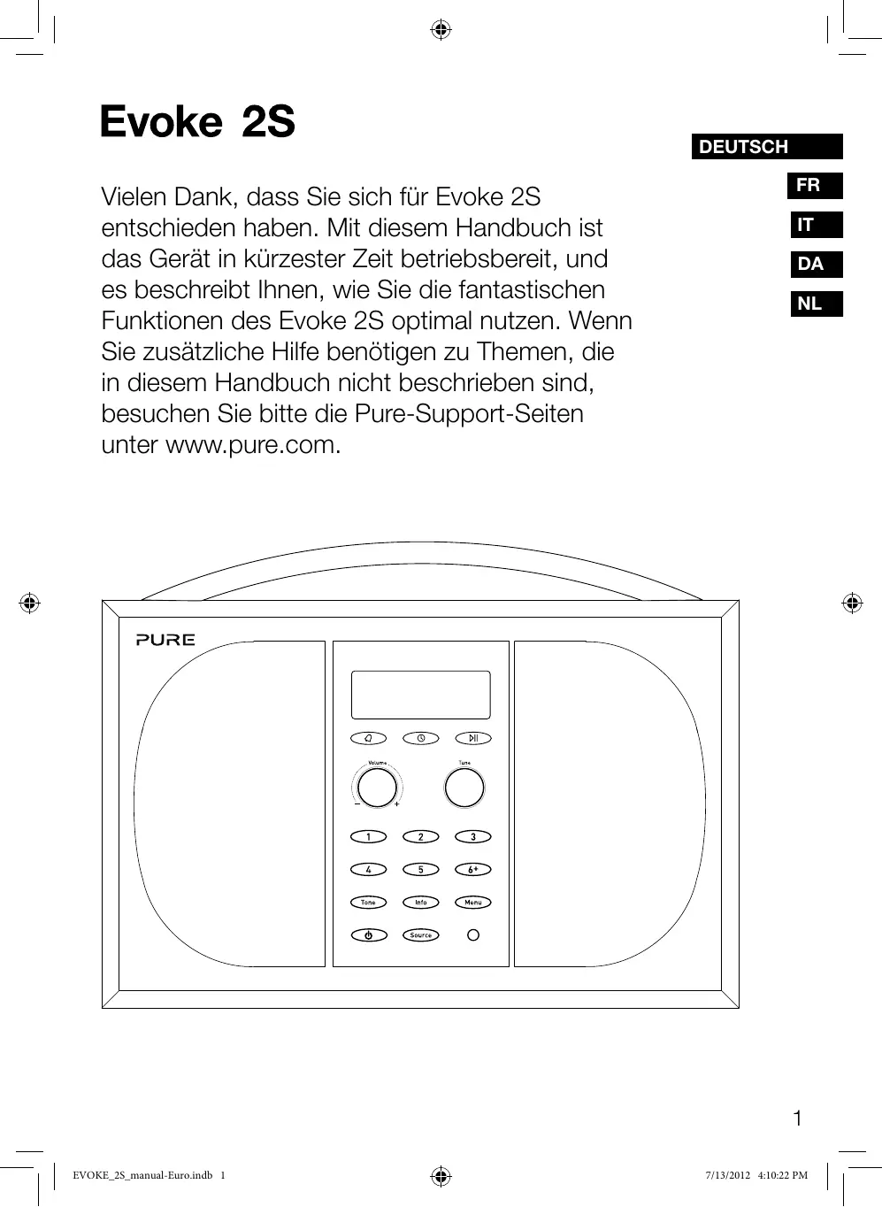 EVOKE_2S_manual-Euro.indb 1 7/13/2012 4:10:22 PM EVOKE_2S_manual-Euro.indb 2 7/13/2012 4:10:22 PM DEUTSCH Vielen Dank, dass Sie sich für Evoke 2S entschieden haben. Mit diesem Handbuch ist das Gerät in kürzester Zeit betriebsbereit, und es beschreibt Ihnen, wie Sie die fantastischen Funktionen des Evoke 2S optimal nutzen. Wenn Sie zusätzliche Hilfe benötigen zu Themen, die in diesem Handbuch nicht beschrieben sind, besuchen Sie bitte die Pure-Support-Seiten unter www.pure.com.