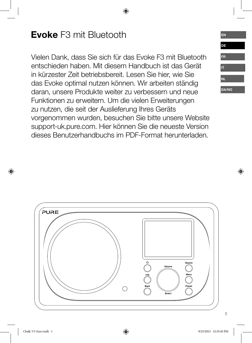 EN DE Vielen Dank, dass Sie sich für das Evoke F3 mit Bluetooth entschieden haben. Mit diesem Handbuch ist das Gerät in kürzester Zeit betriebsbereit. Lesen Sie hier, wie Sie das Evoke optimal nutzen können. Wir arbeiten ständig daran, unsere Produkte weiter zu verbessern und neue Funktionen zu erweitern. Um die vielen Erweiterungen zu nutzen, die seit der Auslieferung Ihres Geräts vorgenommen wurden, besuchen Sie bitte unsere Website support-uk.pure.com. Hier können Sie die neueste Version dieses Benutzerhandbuchs im PDF-Format herunterladen.