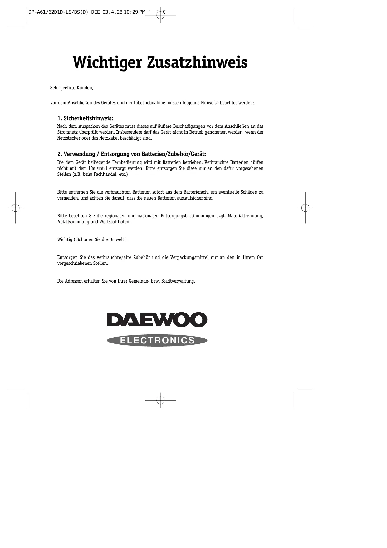 Finden Sie kostenlos die Bedienungsanleitung des Geräts DQD-2113D DAEWOO als PDF.
