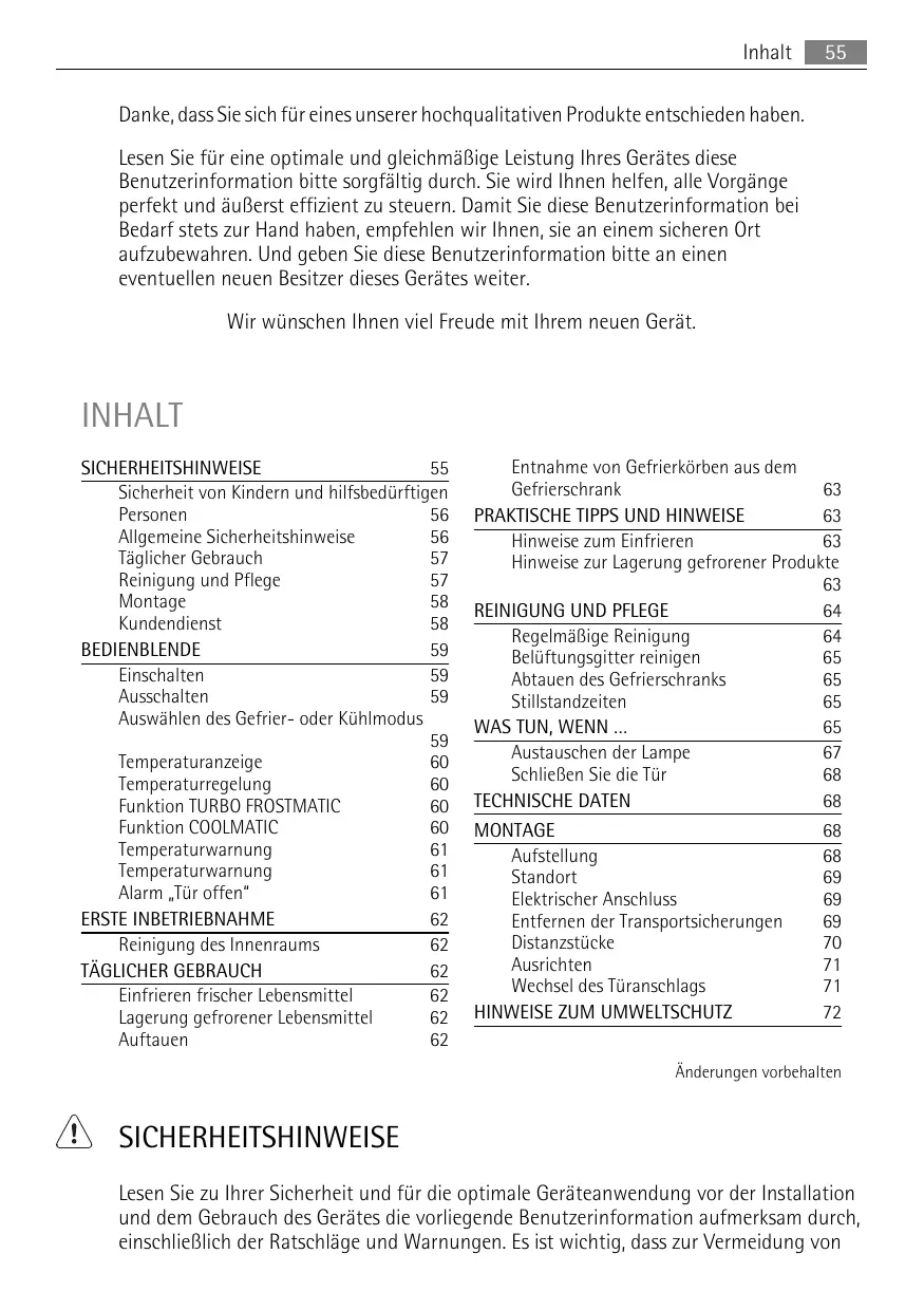 Danke, dass Sie sich für eines unserer hochqualitativen Produkte entschieden haben. Lesen Sie für eine optimale und gleichmäßige Leistung Ihres Gerätes diese Benutzerinformation bitte sorgfältig durch. Sie wird Ihnen helfen, alle Vorgänge perfekt und äußerst effizient zu steuern. Damit Sie diese Benutzerinformation bei Bedarf stets zur Hand haben, empfehlen wir Ihnen, sie an einem sicheren Ort aufzubewahren. Und geben Sie diese Benutzerinformation bitte an einen eventuellen neuen Besitzer dieses Gerätes weiter. Wir wünschen Ihnen viel Freude mit Ihrem neuen Gerät. INHALT SICHERHEITSHINWEISE Sicherheit von Kindern und hilfsbedürftigen Personen Allgemeine Sicherheitshinweise Täglicher Gebrauch Reinigung und Pflege Montage Kundendienst BEDIENBLENDE Einschalten Ausschalten Auswählen des Gefrier- oder Kühlmodus Temperaturanzeige Temperaturregelung Funktion TURBO FROSTMATIC Funktion COOLMATIC Temperaturwarnung Temperaturwarnung Alarm „Tür offen“ ERSTE INBETRIEBNAHME Reinigung des Innenraums