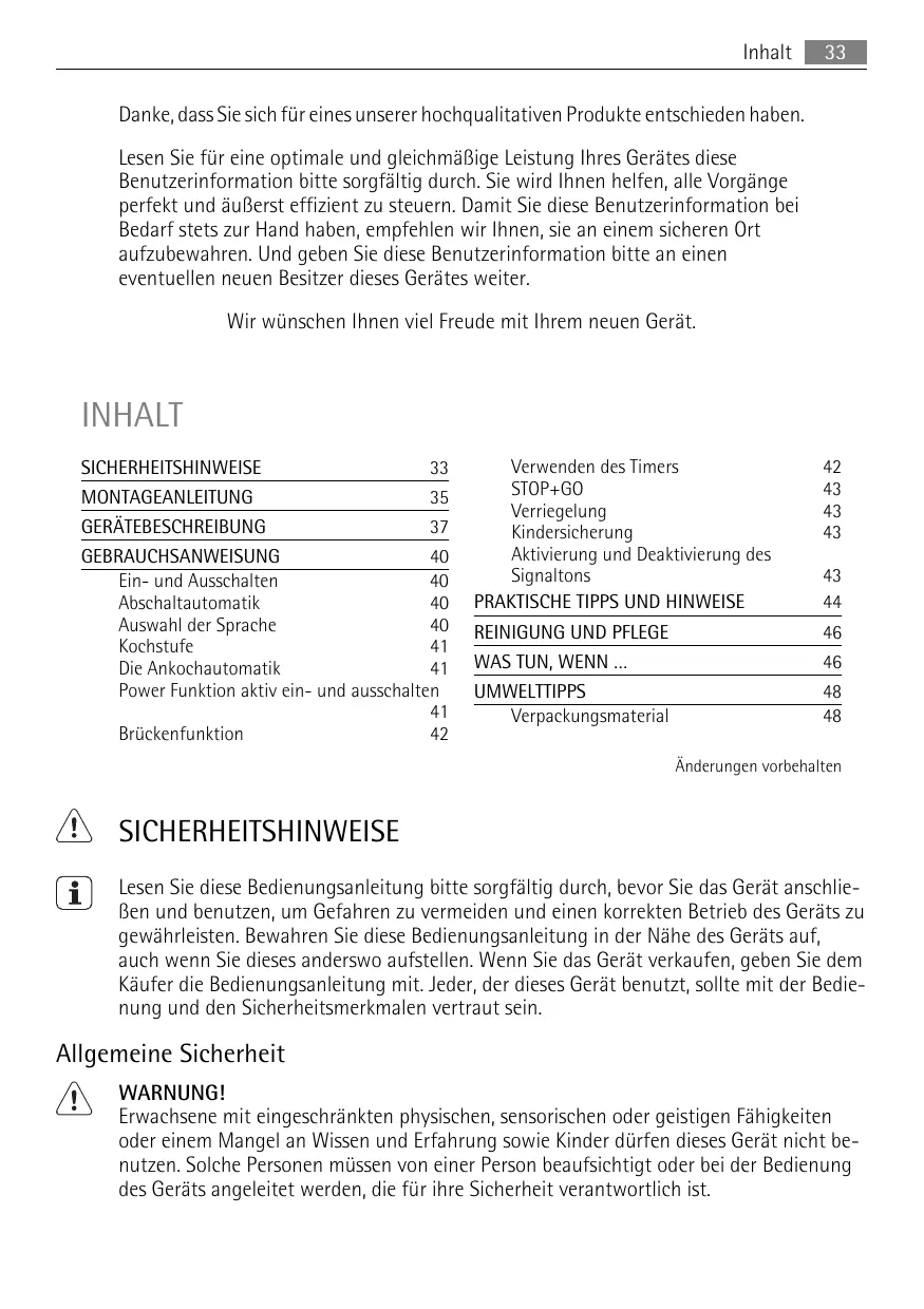 Danke, dass Sie sich für eines unserer hochqualitativen Produkte entschieden haben. Lesen Sie für eine optimale und gleichmäßige Leistung Ihres Gerätes diese Benutzerinformation bitte sorgfältig durch. Sie wird Ihnen helfen, alle Vorgänge perfekt und äußerst effizient zu steuern. Damit Sie diese Benutzerinformation bei Bedarf stets zur Hand haben, empfehlen wir Ihnen, sie an einem sicheren Ort aufzubewahren. Und geben Sie diese Benutzerinformation bitte an einen eventuellen neuen Besitzer dieses Gerätes weiter. Wir wünschen Ihnen viel Freude mit Ihrem neuen Gerät. INHALT SICHERHEITSHINWEISE MONTAGEANLEITUNG
