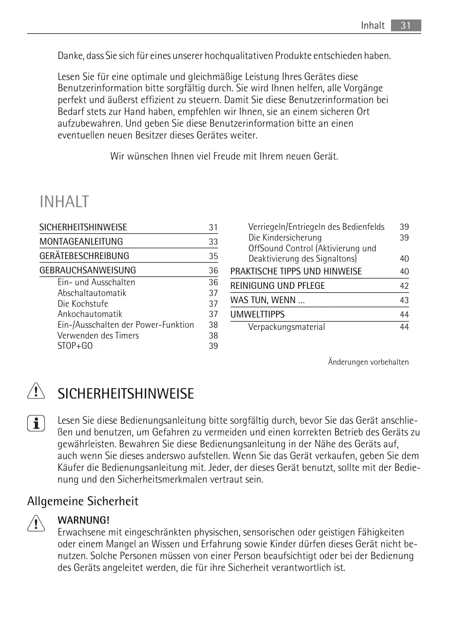 Änderungen vorbehalten SICHERHEITSHINWEISE Lesen Sie diese Bedienungsanleitung bitte sorgfältig durch, bevor Sie das Gerät anschließen und benutzen, um Gefahren zu vermeiden und einen korrekten Betrieb des Geräts zu gewährleisten. Bewahren Sie diese Bedienungsanleitung in der Nähe des Geräts auf, auch wenn Sie dieses anderswo aufstellen. Wenn Sie das Gerät verkaufen, geben Sie dem Käufer die Bedienungsanleitung mit. Jeder, der dieses Gerät benutzt, sollte mit der Bedienung und den Sicherheitsmerkmalen vertraut sein. Allgemeine Sicherheit WARNUNG! Erwachsene mit eingeschränkten physischen, sensorischen oder geistigen Fähigkeiten oder einem Mangel an Wissen und Erfahrung sowie Kinder dürfen dieses Gerät nicht benutzen. Solche Personen müssen von einer Person beaufsichtigt oder bei der Bedienung des Geräts angeleitet werden, die für ihre Sicherheit verantwortlich ist.