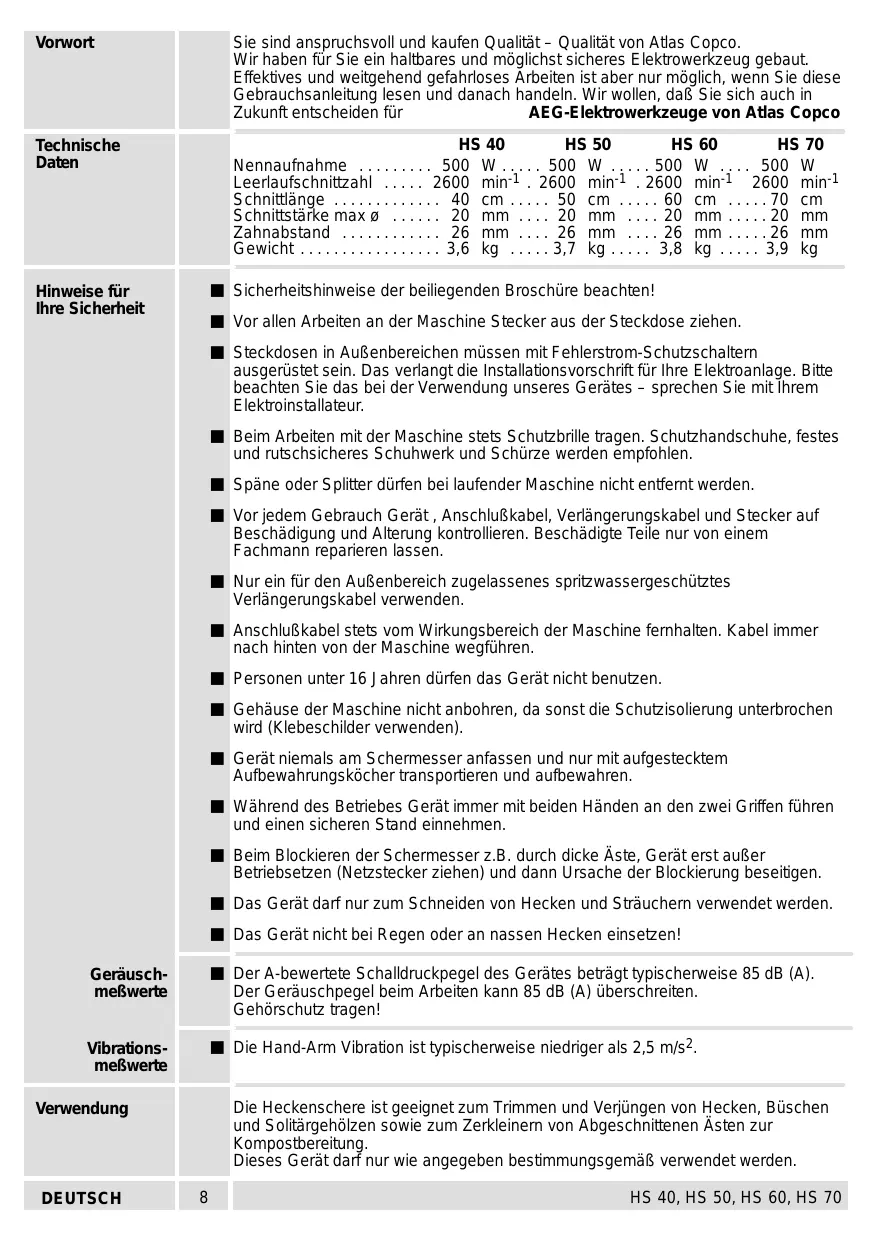 | Vorwort | Sie sind anspruchsvoll und kaufen Qualität - Qualität von Atlas Copco. Wir haben für Sie ein haltbares und möglichst sicheres Elektrowerkzeug gebaut. Effektives undweitgehend gefährloses Arbeititen ist aber nur möglich, wenn Sie diese Gebrauchsanleitung lesen und danach handeln. Wir wollen, daß Sie sich auch in Zukunft entscheiden für AEG-Elektrowerkzeuge von Atlas Copco |