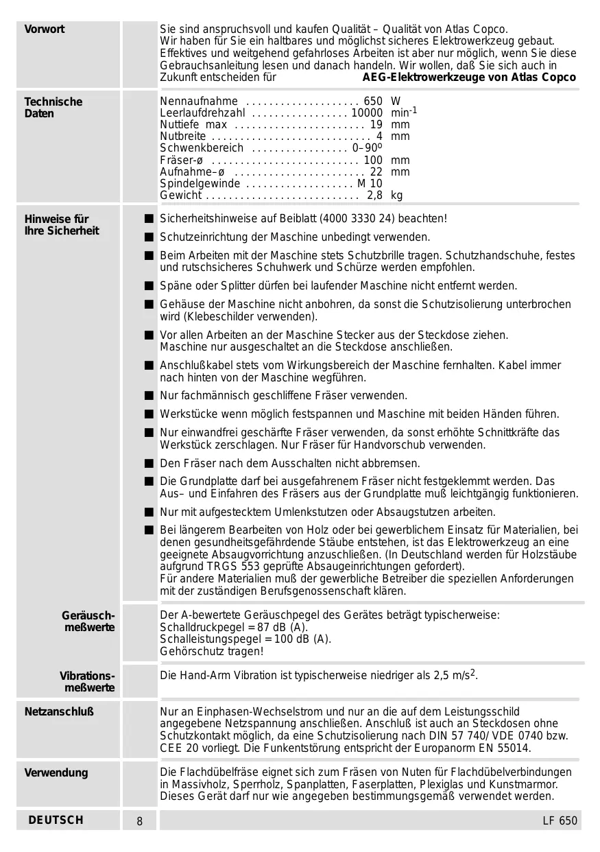 LF 650 Vorwort Sie sind anspruchsvoll und kaufen Qualität – Qualität von Atlas Copco. Wir haben für Sie ein haltbares und möglichst sicheres Elektrowerkzeug gebaut. Effektives und weitgehend gefahrloses Arbeiten ist aber nur möglich, wenn Sie diese Gebrauchsanleitung lesen und danach handeln. Wir wollen, daß Sie sich auch in Zukunft entscheiden für AEG-Elektrowerkzeuge von Atlas Copco Technische Daten Nennaufnahme . . . . . . . . . . . . . . . . . . . . 650 Leerlaufdrehzahl . . . . . . . . . . . . . . . . . 10000 Nuttiefe max . . . . . . . . . . . . . . . . . . . . . . . 19 Nutbreite . . . . . . . . . . . . . . . . . . . . . . . . . . . . 4 Schwenkbereich . . . . . . . . . . . . . . . . . 0–90o Fräser-ø . . . . . . . . . . . . . . . . . . . . . . . . . . 100 Aufnahme–ø . . . . . . . . . . . . . . . . . . . . . . . 22 Spindelgewinde . . . . . . . . . . . . . . . . . . . M 10 Gewicht . . . . . . . . . . . . . . . . . . . . . . . . . . . 2,8