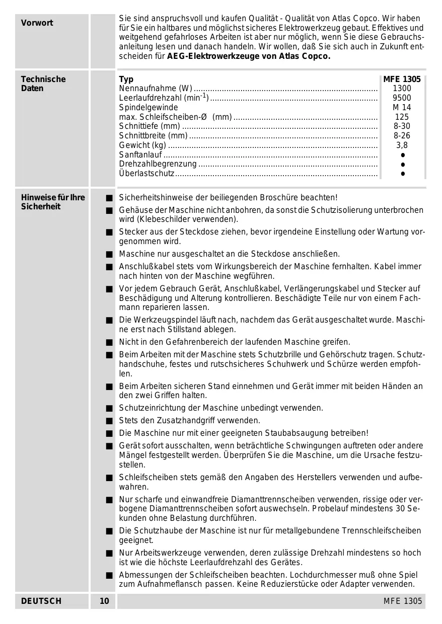 MFE 1305 Sie sind anspruchsvoll und kaufen Qualität - Qualität von Atlas Copco. Wir haben für Sie ein haltbares und möglichst sicheres Elektrowerkzeug gebaut. Effektives und weitgehend gefahrloses Arbeiten ist aber nur möglich, wenn Sie diese Gebrauchsanleitung lesen und danach handeln. Wir wollen, daß Sie sich auch in Zukunft entscheiden für AEG-Elektrowerkzeuge von Atlas Copco. Vorwort Technische Daten Typ MFE 1305 Nennaufnahme (W) ...............................................................................