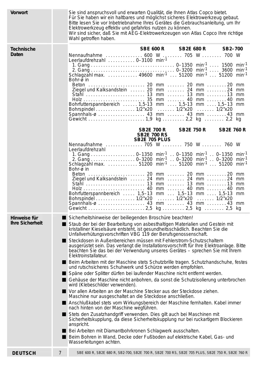 (pas sur SB2–700) Accouplement de sécurité intégré empêchant l’entraînement de la machine en cas de blocage du foret. (uniquement sur SB2E 700 RS, SB2E 705 PLUS)