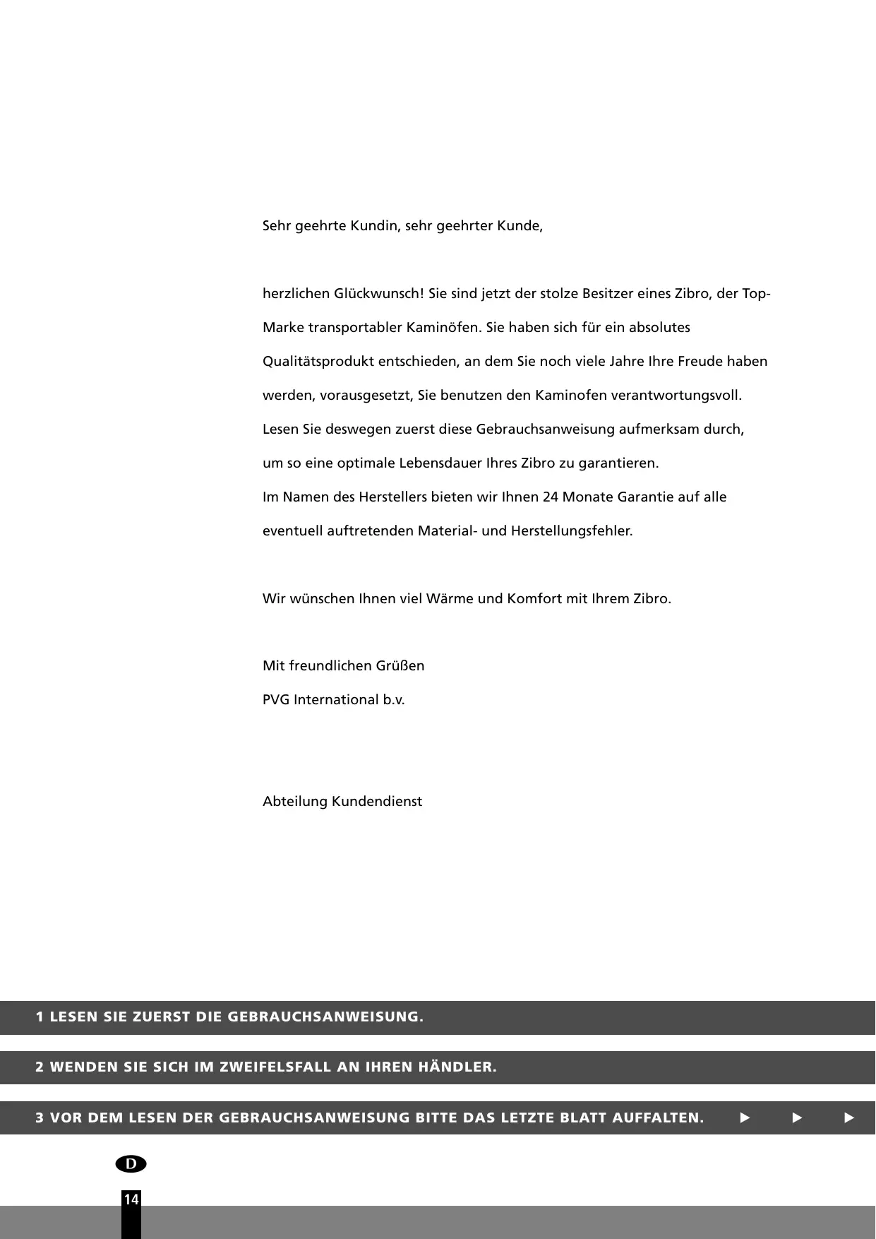 Sehr geehrte Kundin, sehr geehrter Kunde, herzlichen Glückwunsch! Sie sind jetzt der stolze Besitzer eines Zibro, der TopMarke transportabler Kaminöfen. Sie haben sich für ein absolutes Qualitätsprodukt entschieden, an dem Sie noch viele Jahre Ihre Freude haben werden, vorausgesetzt, Sie benutzen den Kaminofen verantwortungsvoll. Lesen Sie deswegen zuerst diese Gebrauchsanweisung aufmerksam durch, um so eine optimale Lebensdauer Ihres Zibro zu garantieren. Im Namen des Herstellers bieten wir Ihnen 24 Monate Garantie auf alle eventuell auftretenden Material- und Herstellungsfehler. Wir wünschen Ihnen viel Wärme und Komfort mit Ihrem Zibro. Mit freundlichen Grüßen PVG International b.v. Abteilung Kundendienst 1 LESEN SIE ZUERST DIE GEBRAUCHSANWEISUNG. 2 WENDEN SIE SICH IM ZWEIFELSFALL AN IHREN HÄNDLER. 3 VOR DEM LESEN DER GEBRAUCHSANWEISUNG BITTE DAS LETZTE BLATT AUFFALTEN.