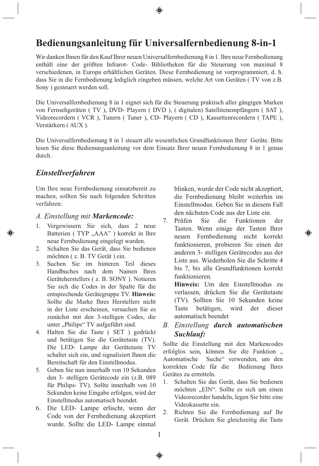 Bedienungsanleitung für Universalfernbedienung 8-in-1 Wir danken Ihnen für den Kauf Threr neuen Universalfernbedienung 8 in 1. Ihre neue Fernbedienung enthält eine der grôiten Infrarot- Code- Bibliotheken für die Steuerung von maximal 8 verschiedenen, in Europa erhältlichen Geräten. Diese Fernbedienung ist vorprogrammiert, d. h. dass Sie in die Fernbedienung lediglich eingeben müssen, welche Art von Geräten (TV von z.B. Sony ) gesteuert werden soll. Die Universalfernbedienung 8 in 1 eignet sich für die Steuerung praktisch aller gängigen Marken von Fernsehgeräten ( TV ), DVD- Playern ( DVD ), ( digitalen) Satellitenempfängern ( SAT ), Videorecordern ( VCR ), Tunern ( Tuner ), CD- Playern ( CD ), Kassettenrecordern ( TAPE ), Verstärkern ( AUX ). Die Universalfernbedienung 8 in 1 steuert alle wesentlichen Grundfunktionen Ihrer Geräte. Bitte lesen Sie diese Bedienungsanleitung vor dem Einsatz Ihrer neuen Fernbedienung 8 in 1 genau durch. Eïinstellverfahren Um Ihre neue Fernbedienung einsatzbereit zu blinken, wurde der Code nicht akzeptiert, machen, sollten Sie nach folgenden Schritten die Fernbedienung bleibt weiterhin im verfahren: Einstellmodus. Geben Sie in diesem Fall den nächsten Code aus der Liste ein.