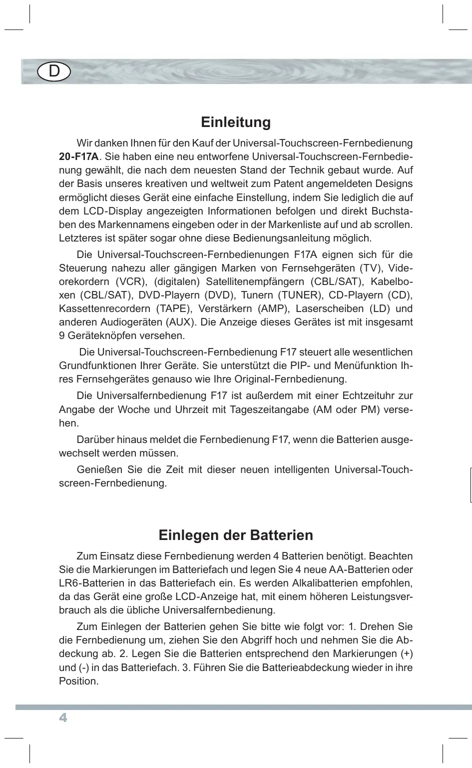 Einleitung Wir danken Ihnen für den Kauf der Universal-Touchscreen-Fernbedienung 20-F17A. Sie haben eine neu entworfene Universal-Touchscreen-Fernbedienung gewählt, die nach dem neuesten Stand der Technik gebaut wurde. Auf der Basis unseres kreativen und weltweit zum Patent angemeldeten Designs ermöglicht dieses Gerät eine einfache Einstellung, indem Sie lediglich die auf dem LCD-Display angezeigten Informationen befolgen und direkt Buchstaben des Markennamens eingeben oder in der Markenliste auf und ab scrollen. Letzteres ist später sogar ohne diese Bedienungsanleitung möglich. Die Universal-Touchscreen-Fernbedienungen F17A eignen sich für die Steuerung nahezu aller gängigen Marken von Fernsehgeräten (TV), Videorekordern (VCR), (digitalen) Satellitenempfängern (CBL/SAT), Kabelboxen (CBL/SAT), DVD-Playern (DVD), Tunern (TUNER), CD-Playern (CD), Kassettenrecordern (TAPE), Verstärkern (AMP), Laserscheiben (LD) und anderen Audiogeräten (AUX). Die Anzeige dieses Gerätes ist mit insgesamt 9 Geräteknöpfen versehen. Die Universal-Touchscreen-Fernbedienung F17 steuert alle wesentlichen Grundfunktionen Ihrer Geräte. Sie unterstützt die PIP- und Menüfunktion Ihres Fernsehgerätes genauso wie Ihre Original-Fernbedienung. Die Universalfernbedienung F17 ist außerdem mit einer Echtzeituhr zur Angabe der Woche und Uhrzeit mit Tageszeitangabe (AM oder PM) versehen. Darüber hinaus meldet die Fernbedienung F17, wenn die Batterien ausgewechselt werden müssen. Genießen Sie die Zeit mit dieser neuen intelligenten Universal-Touchscreen-Fernbedienung. Einlegen der Batterien Zum Einsatz diese Fernbedienung werden 4 Batterien benötigt. Beachten Sie die Markierungen im Batteriefach und legen Sie 4 neue AA-Batterien oder LR6-Batterien in das Batteriefach ein. Es werden Alkalibatterien empfohlen, da das Gerät eine große LCD-Anzeige hat, mit einem höheren Leistungsverbrauch als die übliche Universalfernbedienung. Zum Einlegen der Batterien gehen Sie bitte wie folgt vor: 1. Drehen Sie die Fernbedienung um, ziehen Sie den Abgriff hoch und nehmen Sie die Abdeckung ab. 2. Legen Sie die Batterien entsprechend den Markierungen (+) und (-) in das Batteriefach. 3. Führen Sie die Batterieabdeckung wieder in ihre Position.