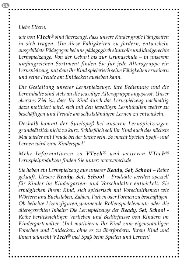 DE Liebe Eltern, wir von VTech® sind überzeugt, dass unsere Kinder große Fähigkeiten in sich tragen. Um diese Fähigkeiten zu fördern, entwickeln ausgebildete Pädagogen bei uns pädagogisch sinnvolle und kindgerechte
