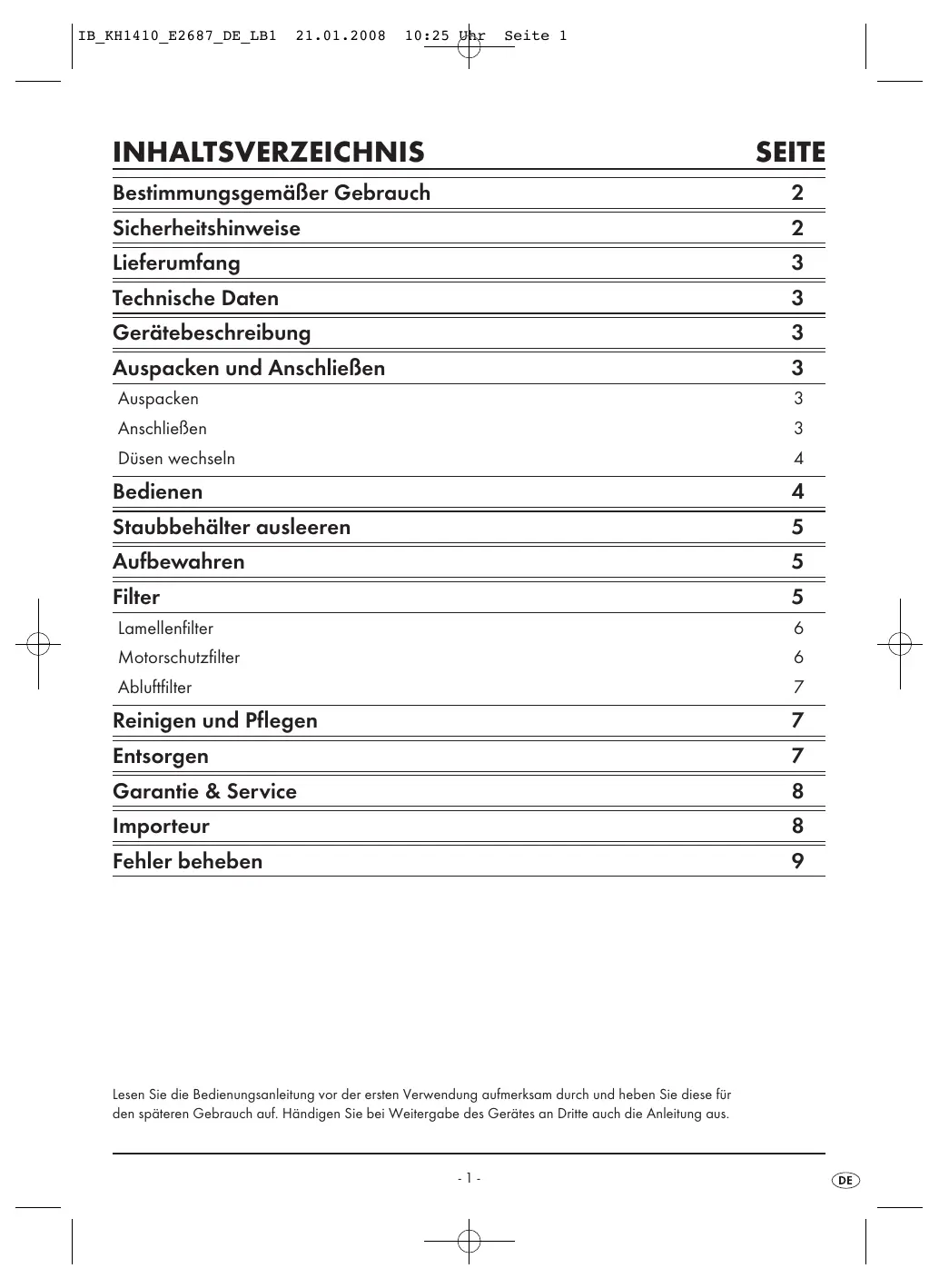 10:25 Uhr Seite 1 INHALTSVERZEICHNIS SEITE Bestimmungsgemäßer Gebrauch