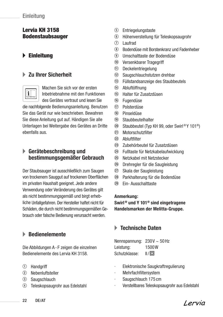 Handgriff Nebenluftsteller Saugschlauch Teleskopsaugrohr aus Edelstahl DE/AT T Entriegelungstaste Y Höhenverstellung für Teleskopsaugrohr U Laufrad I Bodendüse mit Borstenkranz und Fadenheber O Umschalttaste der Bodendüse P Versenkbarer Tragegriff { Deckelentriegelung } Saugschlauchstutzen drehbar q Füllstandsanzeige des Staubbeutels w Abluftöffnung e Halter für Zusatzdüsen r Fugendüse t Polsterdüse y Pinseldüse u Staubbeutelhalter i Staubbeutel (Typ KH 99, oder Swirl ® Y 101®) o Motorschutzfilter p Abluftfilter [ Zubehörbeutel für Zusatzdüsen ] Fußtaste für Netzkabelaufwicklung A Netzkabel mit Netzstecker S Drehregler für die Saugleistung D Skala der Saugleistung F Parkhalterung für die Bodendüse G Ein- Ausschalttaste Anmerkung: Swirl ® und Y 101® sind eingetragene Handelsmarken der Melitta-Gruppe. A Technische Daten Nennspannung: 230 V ~ 50 Hz Leistung: 1500 W Schutzklasse: II / &