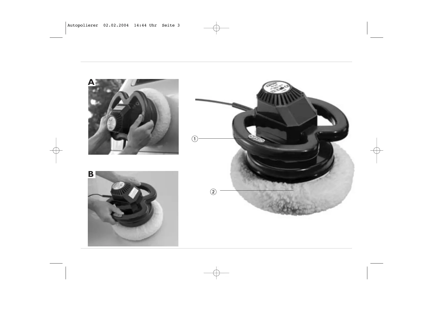 07. Contrôlez encore une fois si toutes les instructions de sécurité sont bien respectées. 08. Prenez les deux poignées de l’appareil fermement dans les mains et mettez l’appareil en marche en appuyant sur le commutateur (voir aussi image A). 09. Passer régulièrement la polisseuse sur la peinture (voir aussi image B). · ATTENTION ! Ne pas appuyer sur la polisseuse ! Le poids propre de l’appareil suffit parfaitement à exercer la pression nécessaire pour le processus de travail. · Les angles et les surfaces en profondeur inaccessibles doivent être traitées ultérieurement à la main. Utilisez pour cela le bonnet retiré de la lustreuse. •