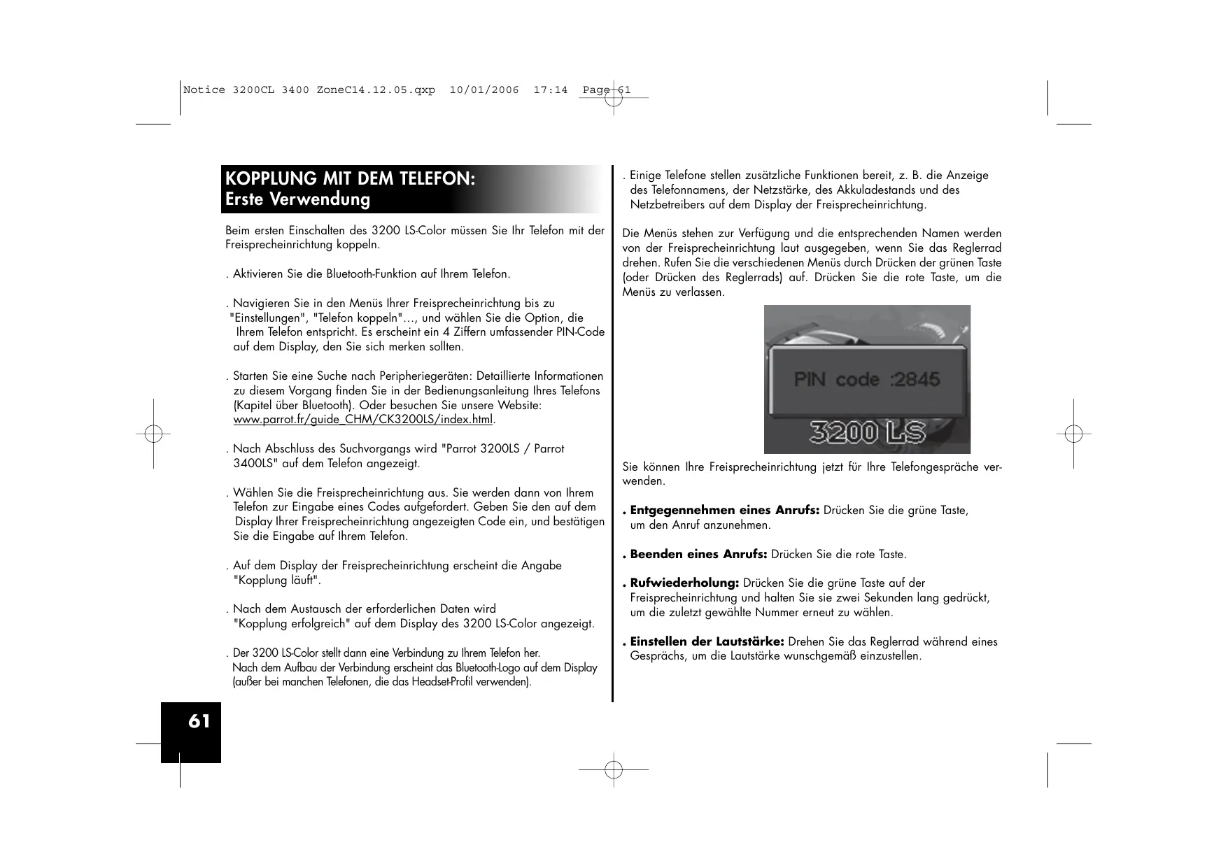 Notice 3200CL 3400 ZoneC14.12.05.qxp 10/01/2006 17:14 Page 61 KOPPLUNG MIT DEM TELEFON: Erste Verwendung . Einige Telefone stellen zusätzliche Funktionen bereit, z. B. die Anzeige des Telefonnamens, der Netzstärke, des Akkuladestands und des Netzbetreibers auf dem Display der Freisprecheinrichtung. Beim ersten Einschalten des 3200 LS-Color müssen Sie Ihr Telefon mit der Freisprecheinrichtung koppeln. Die Menüs stehen zur Verfügung und die entsprechenden Namen werden von der Freisprecheinrichtung laut ausgegeben, wenn Sie das Reglerrad drehen. Rufen Sie die verschiedenen Menüs durch Drücken der grünen Taste (oder Drücken des Reglerrads) auf. Drücken Sie die rote Taste, um die Menüs zu verlassen. . Aktivieren Sie die Bluetooth-Funktion auf Ihrem Telefon. . Navigieren Sie in den Menüs Ihrer Freisprecheinrichtung bis zu "Einstellungen", "Telefon koppeln"…, und wählen Sie die Option, die Ihrem Telefon entspricht. Es erscheint ein 4 Ziffern umfassender PIN-Code auf dem Display, den Sie sich merken sollten. . Starten Sie eine Suche nach Peripheriegeräten: Detaillierte Informationen zu diesem Vorgang finden Sie in der Bedienungsanleitung Ihres Telefons (Kapitel über Bluetooth). Oder besuchen Sie unsere Website: www.parrot.fr/guide_CHM/CK3200LS/index.html. . Nach Abschluss des Suchvorgangs wird "Parrot 3200LS / Parrot 3400LS" auf dem Telefon angezeigt. . Wählen Sie die Freisprecheinrichtung aus. Sie werden dann von Ihrem Telefon zur Eingabe eines Codes aufgefordert. Geben Sie den auf dem Display Ihrer Freisprecheinrichtung angezeigten Code ein, und bestätigen Sie die Eingabe auf Ihrem Telefon. . Auf dem Display der Freisprecheinrichtung erscheint die Angabe "Kopplung läuft". . Nach dem Austausch der erforderlichen Daten wird "Kopplung erfolgreich" auf dem Display des 3200 LS-Color angezeigt. . Der 3200 LS-Color stellt dann eine Verbindung zu Ihrem Telefon her. Nach dem Aufbau der Verbindung erscheint das Bluetooth-Logo auf dem Display (außer bei manchen Telefonen, die das Headset-Profil verwenden).