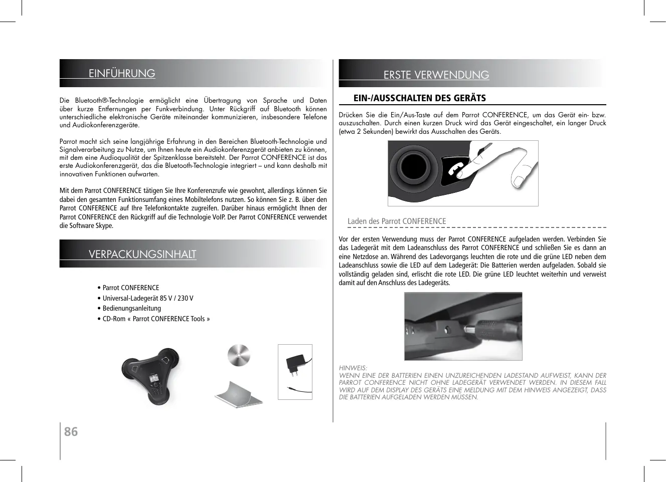 P einführung p verpackungsinhalt erste verwendung p ein/ausschalten des geräts P laden des parrot CONFERENCE P Beschreibung des parrot CONFERENCE Funktionen P verwendung eines bluetooth-telefons P Installation des parrot CONFERENCE P navigation in den menüs