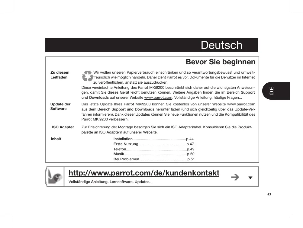 zu verëffentiichen, anstatt sie auszudrucken. Diese vereinfachte Anleitung des Parrot MK9200 beschränkt sich daher auf die wichtigsten Anweïsun- gen, damit Sie dieses Gerät leicht benutzen kënnen. Weitere Angaben finden Sie im Bereich Support und Downloads auf unserer Website www.parrot.com: Vollständige Anleitung, häufige Fragen.
