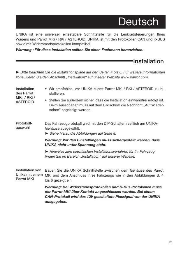 MKi/ RKI/ Asteroid Avertissement : Connectez l'après-contact au Parrot MKI si le véhicule est basé sur un protocole résistif ou K-Bus. En revanche, le signal 12V après-contact est fourni par l'UNIKA si le véhicule est basé sur un protocole CAN.