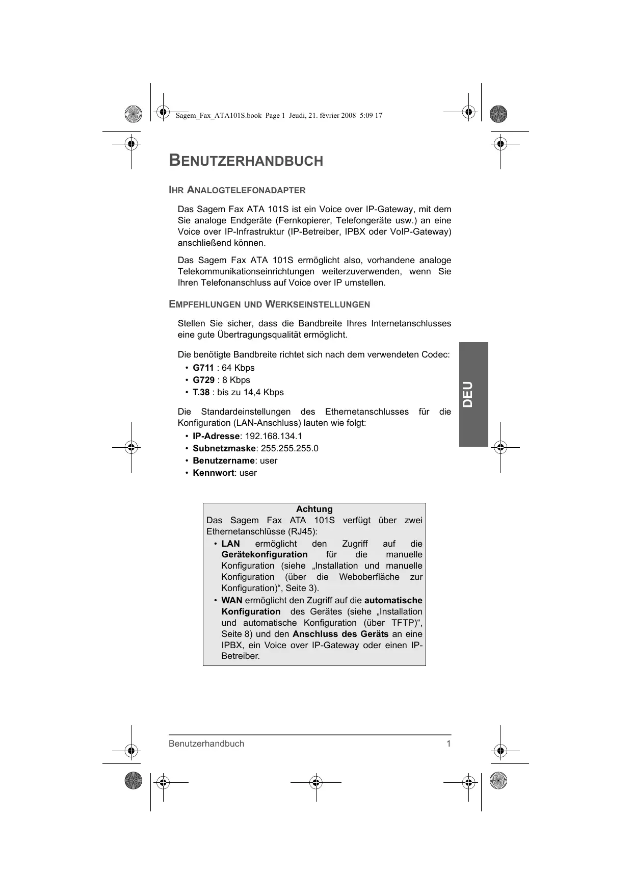 Consignes de sécurité 12 Alimentation électrique 12 • WAN permet d'accéder à la configuration automatique du boîtier (voir “Installation et configuration automatique (via TFTP)”, page 8) et de connecter le boîtier à un IPBX, à une passerelle VoIP ou à un opérateur IP.