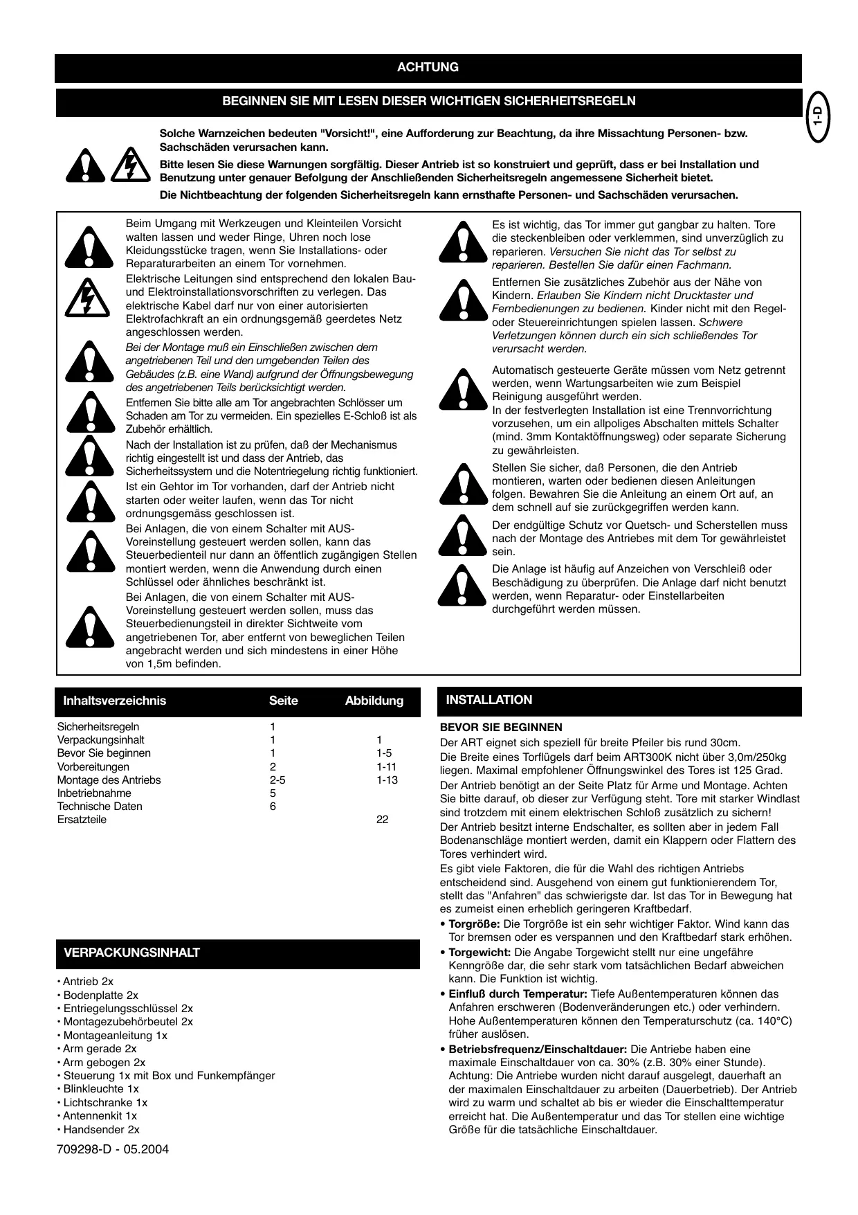 1-F AVERTISSEMENT Contrôler le contenu de l'emballage et lire attentivement les présentes instructions. S'assurer du parfait fonctionnement de votre système de portail. Le portail doit pivoter de manière régulière, sans à-coups, et ne coincer nulle part. Tenir compte du fait que le sol peut être rehaussé de quelques centimètres en hiver. Afin d'éviter tout mouvement pendulaire gênant, le portail doit être stable et présenter un jeu aussi faible que possible. Plus le battant pivote en douceur, et plus la force devra être réglée avec précision.