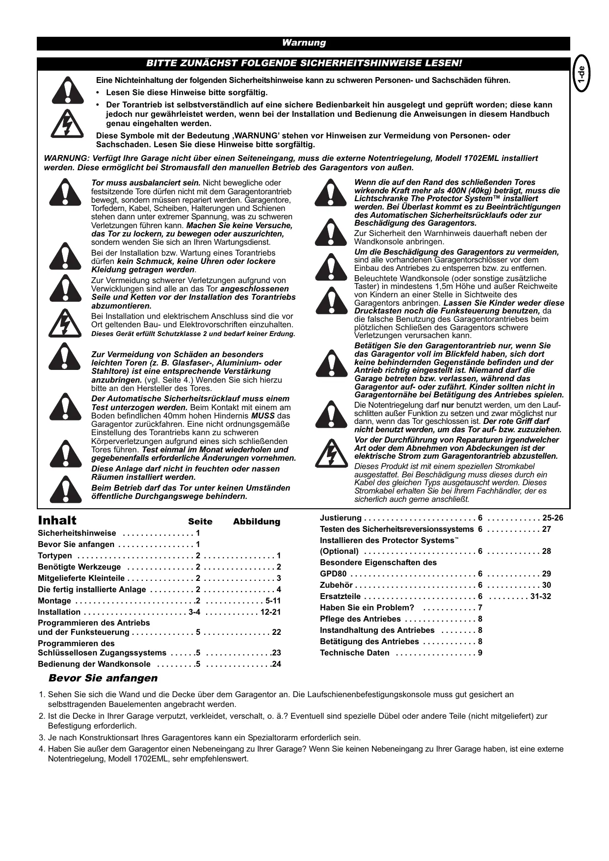 - Der Torantrieb ist selbstverständlich auf eine sichere Bedienbarkeit hin ausgelegt und geprüft worden; diese kann jedoch nur gewährleistet werden, wenn bei der Installation und Bedienung die Anweisungen in diesem Handbuch genau eingehalten werden. Diese Symbole mit der Bedeutung ‚WARNUNG’ stehen vor Hinweisen zur Vermeidung von Personen- oder Sachschaden. Lesen Sie diese Hinweise bitte sorgfältig. WARNUNG: Verfügt Ihre Garage nicht über einen Seiteneingang, muss die externe Notentriegelung, Modell 1702EML installiert werden. Diese ermöglicht bei Stromausfall den manuellen Betrieb des Garagentors von außen. Tor muss ausbalanciert sein. Nicht bewegliche oder festsitzende Tore dürfen nicht mit dem Garagentorantrieb bewegt, sondern müssen repariert werden. Garagentore, Torfedern, Kabel, Scheiben, Halterungen und Schienen stehen dann unter extremer Spannung, was zu schweren Verletzungen führen kann. Machen Sie keine Versuche, das Tor zu lockern, zu bewegen oder auszurichten, sondern wenden Sie sich an Ihren Wartungsdienst. Bei der Installation bzw. Wartung eines Torantriebs dürfen kein Schmuck, keine Uhren oder lockere Kleidung getragen werden. Zur Vermeidung schwerer Verletzungen aufgrund von Verwicklungen sind alle an das Tor angeschlossenen Seile und Ketten vor der Installation des Torantriebs abzumontieren. Bei Installation und elektrischem Anschluss sind die vor Ort geltenden Bau- und Elektrovorschriften einzuhalten. Dieses Gerät erfüllt Schutzklasse 2 und bedarf keiner Erdung. Zur Vermeidung von Schäden an besonders leichten Toren (z. B. Glasfaser-, Aluminium- oder Stahltore) ist eine entsprechende Verstärkung anzubringen. (vgl. Seite 4.) Wenden Sie sich hierzu bitte an den Hersteller des Tores. Der Automatische Sicherheitsrücklauf muss einem Test unterzogen werden. Beim Kontakt mit einem am Boden befindlichen 40mm hohen Hindernis MUSS das Garagentor zurückfahren. Eine nicht ordnungsgemäße Einstellung des Torantriebs kann zu schweren Körperverletzungen aufgrund eines sich schließenden Tores führen. Test einmal im Monat wiederholen und gegebenenfalls erforderliche Änderungen vornehmen. Diese Anlage darf nicht in feuchten oder nassen Räumen installiert werden. Beim Betrieb darf das Tor unter keinen Umständen öffentliche Durchgangswege behindern. Inhalt Seite Sicherheitshinweise . . . . . . . . . . . . . . . . 1 Bevor Sie anfangen . . . . . . . . . . . . . . . . . 1 Tortypen . . . . . . . . . . . . . . . . . . . . . . . . . . 2 Benötigte Werkzeuge . . . . . . . . . . . . . . . 2 Mitgelieferte Kleinteile . . . . . . . . . . . . . . . 2 Die fertig installierte Anlage . . . . . . . . . . 2 Montage . . . . . . . . . . . . . . . . . . . . . . . . . . .2 Installation . . . . . . . . . . . . . . . . . . . . . . . 3-4 Programmieren des Antriebs und der Funksteuerung . . . . . . . . . . . . . . 5 Programmieren des Schlüssellosen Zugangssystems . . . . . .5 Bedienung der Wandkonsole . . . . . . . . .5 Abbildung
