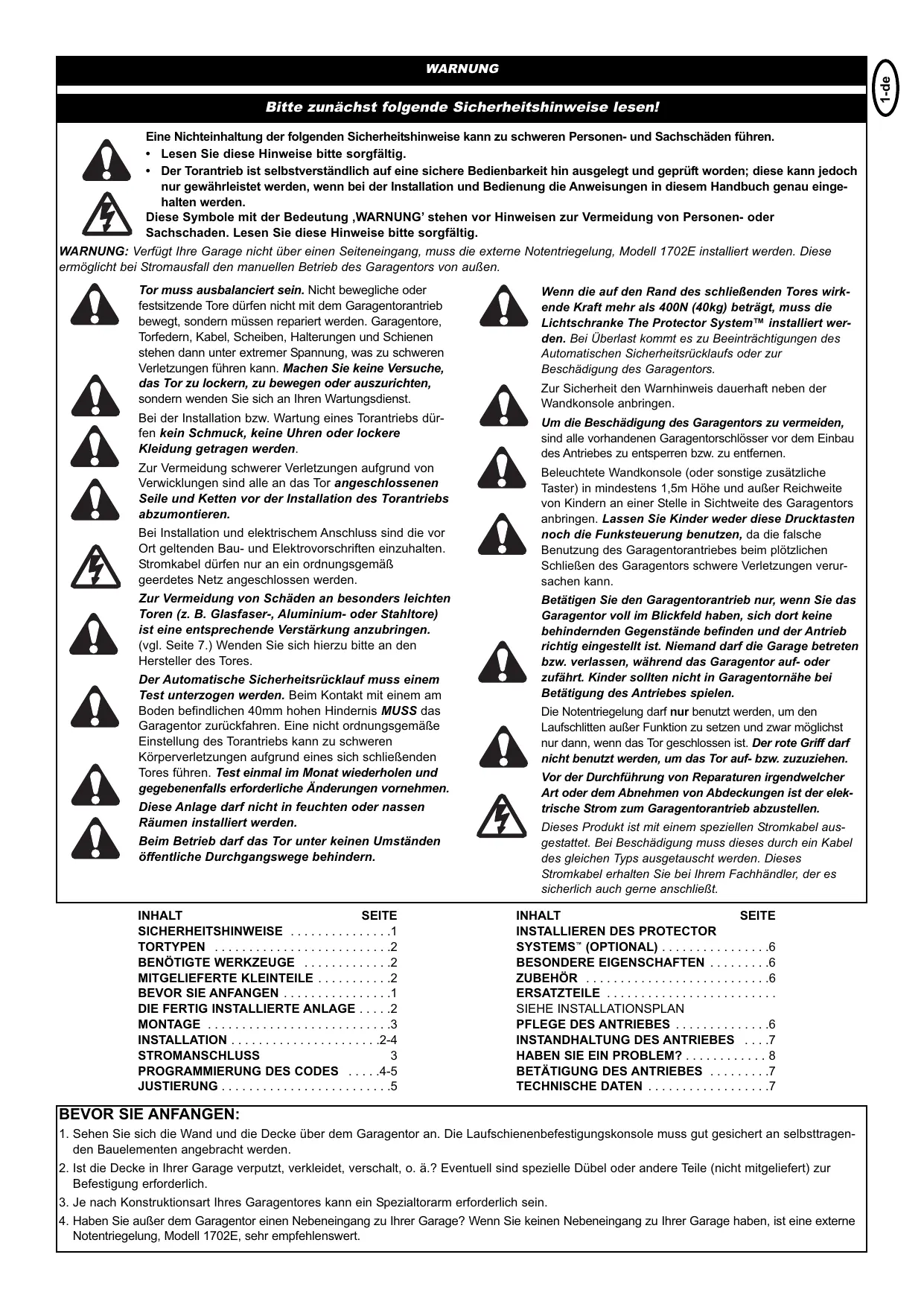 Tanto las puertas de garaje, como los muelles, cables, arandelas, soportes y rieles están sometidos a una tensión extrema, lo que puede generar graves lesiones. No intente ante ninguna circunstancia, aflojar la puerta, desplazarla o alinearla, sino que deberá dirigirse al servicio de asistencia técnica más cercano. Durante la instalación y/o el mantenimiento de un automatismo de puerta no se pueden llevar ni joyas, ni relojes ni prendas holgadas. Para evitar lesiones graves por haberse enrollado, se deberán desmontar todas las cuerdas y cadenas enganchadas conectadas a la puerta antes de instalar el automatismo de puerta. Cuando se efectúe la instalación y la conexión eléctrica, se deberán respetar los reglamentos para edificación y en materia de electricidad vigentes a nivel local. Los cables de la corriente sólo pueden ser conectados a una red con la debida puesta a tierra. Para evitar daños en puertas especialmente ligeras (p. ej. de fibra de vidrio, de aluminio o de acero) se deberá incorporar el correspondiente refuerzo. (Véase página 7.) Para hacerlo, diríjase al fabricante de la puerta. El sistema de inversión de seguridad automático deberá ser sometido a una prueba. Al entrar en contacto con un obstáculo situado a una altura de 40mm del suelo, la puerta de garaje SE DEBE desplazar a la inversa. Un ajuste inadecuado del automatismo de puerta puede provocar graves lesiones personales derivadas del cierre de la puerta. Repita la prueba una vez al mes y efectúe las modificaciones oportunas en caso necesario. La unidad no puede instalarse en espacios húmedos ni mojados. Durante el funcionamiento de la puerta, ésta no puede obstaculizar los pasos peatonales públicos ante ninguna circunstancia