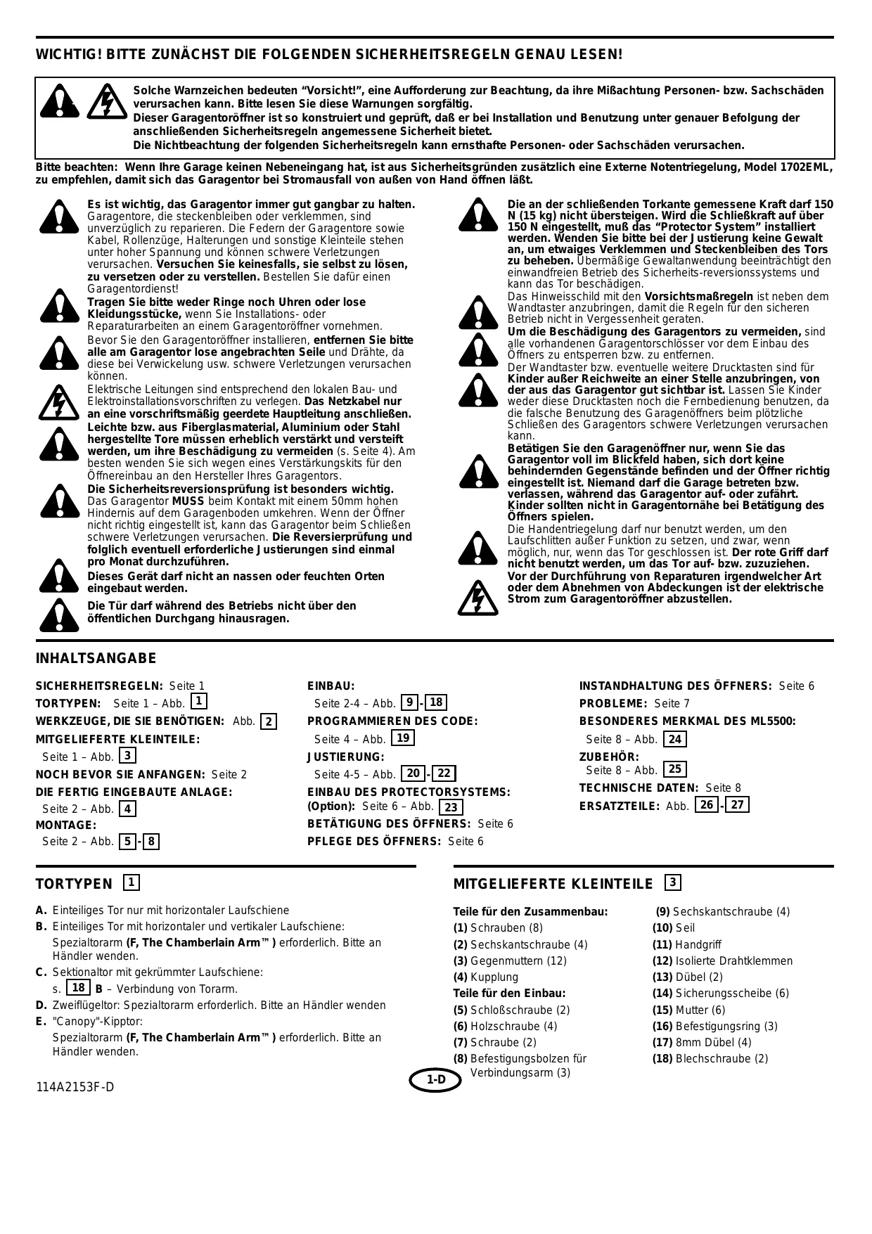 Laden Sie die Anleitung für Ihr Garagentoröffner kostenlos im PDF-Format! Finden Sie Ihr Handbuch MOTORLIFT 5500 - CHAMBERLAIN und nehmen Sie Ihr elektronisches Gerät wieder in die Hand. Auf dieser Seite sind alle Dokumente veröffentlicht, die für die Verwendung Ihres Geräts notwendig sind. MOTORLIFT 5500 von der Marke CHAMBERLAIN.