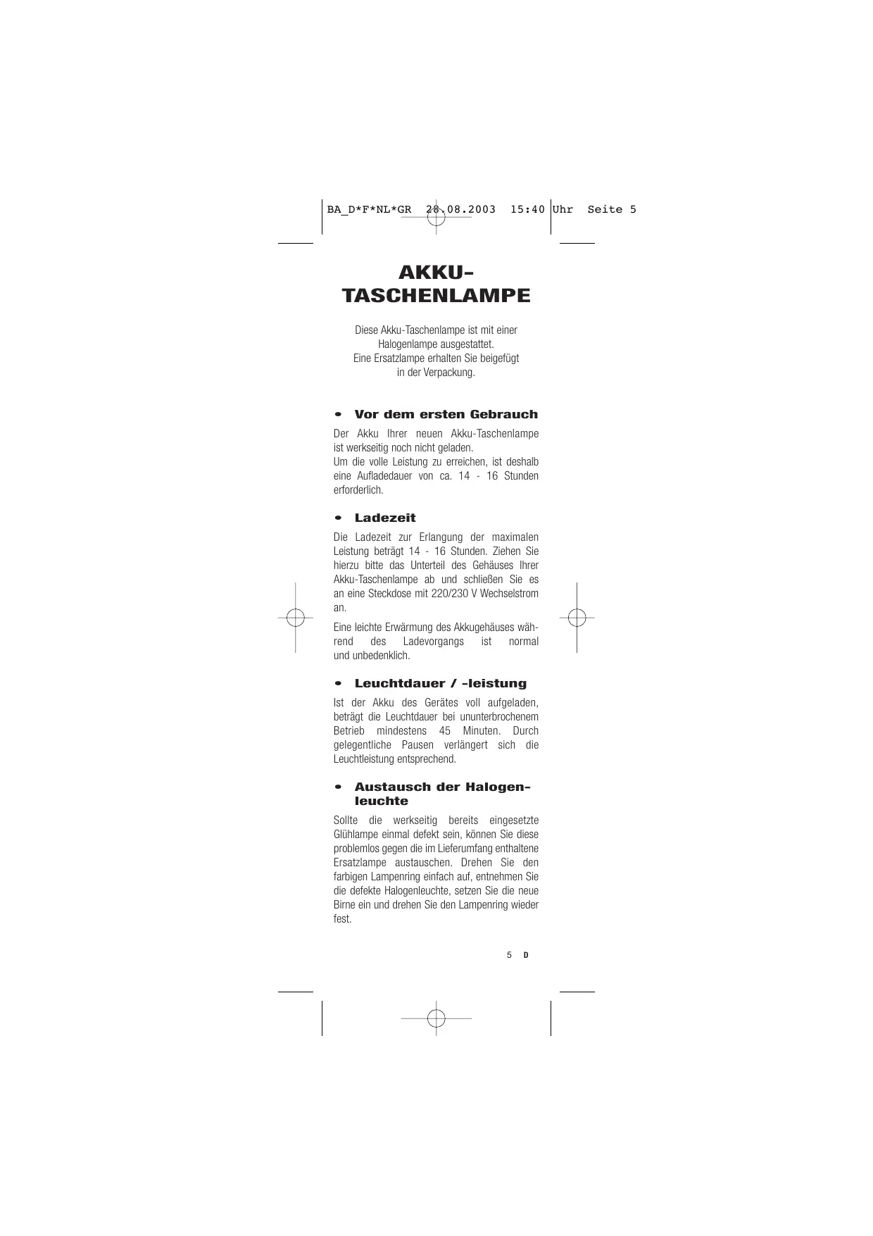 (6) Die Taschenlampe nur im Temperaturbereich von 5^ bis 30^ C verwenden und lagern!