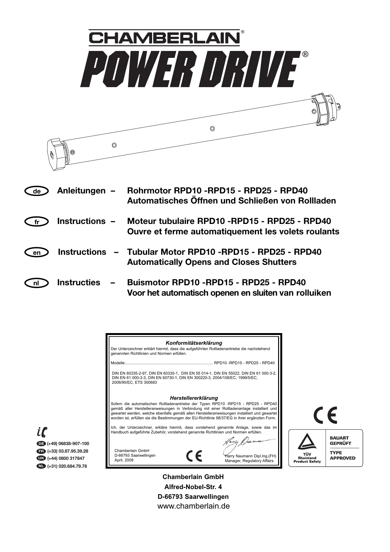GEWÄHRLEISTUNG FÜR DEN ROHRMOTOR Chamberlain GmbH gewährleistet dem Erstkäufer eines RPD10 RPD40 Motors für einen Zeitraum von 24 Monaten (2 Jahre) ab Kaufdatum, daß dieses Produkt frei von Material- und/oder Verarbeitungsfehlern ist. Der Erstkäufer ist verpflichtet, das Produkt bei Empfang auf sichtbare Defekte zu überprüfen. Konditionen: Die Garantie bezieht sich ausschließlich auf die Reparatur oder den Ersatz von defekten Geräteteilen und deckt nicht die Kosten oder Risiken des Transports der defekten Teile oder Produkte. Diese Garantie deckt keine Schäden, die keine Defekte darstellen und durch unsachgemäßen Gebrauch verursacht wurden (einschließlich des Gebrauchs unter unvollständiger Einhaltung der Anweisungen von Chamberlain GmbH zu Installation, Betrieb und Instandhaltung; versäumte Instandhaltung oder Einstellung; jegliche Anpassungen oder Änderungen am Produkt), Arbeitskosten für den Abbau oder Wiedereinbau einer reparierten oder Ersatzeinheit bzw. Ersatzbatterien. Ein von der Garantie gedecktes Produkt, das Material- oder Verarbeitungsfehler aufweist, wird (nach Ermessen von Chamberlain) kostenlos repariert oder ersetzt. Es liegt im Ermessen von Chamberlain GmbH, ob die defekten Teile repariert bzw. durch neue oder im Werk überholte Teile ersetzt werden. Falls das Produkt während der Garantiezeit defekt erscheint, wenden Sie sich bitte an Ihren Verkäufer. Diese Garantie schränkt die Rechte des Käufers nach den national gültigen Gesetzen nicht ein. Sie hat auch keine Auswirkung auf die Rechte des Käufers gegen den Verkäufer, die sich aus dem Kaufvertrag ergeben. Dort, wo keine geltenden nationalen oder EU-Gesetze gelten, ist diese Garantie das einzige Rechtsmittel des Käufers und weder Chamberlain noch ihre Filialen oder Vertreiber sind für Neben- oder Folgeschäden für ausdrückliche oder stillschweigende Garantien im Zusammenhang mit diesem Produkt haftbar. Niemand, auch kein Vertreter, ist berechtigt, für Chamberlain GmbH irgendwelche andere Haftungen in Verbindung mit dem Verkauf dieses Produkts zu übernehmen.