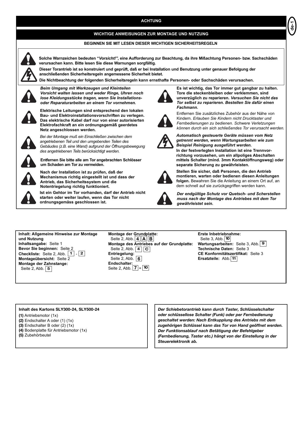 Automatische Torantriebe Modelle SLY300-24, SLY500-24Series erfüllt die Anforderungen der geltenden Abschnitte der Normenvorschriften EN300220-3 • EN55014 • EN61000-3 • EN60555, EN60335-1 • ETS 300 683 • EN60335-1: 2002 • EN60335-2-103: 2003 • EN55014-1: 2000 + A1 + A2 • EN55014-2: 2001 • EN61000-3-2: 2000 • EN61000-3-3: 1995 + A1 • EN 301 489-3, V1.3.1 • EN 300 220-3 V1.1.1 • EN 13241-1 sowie die Bestimmungen und sämtliche Ergänzungen