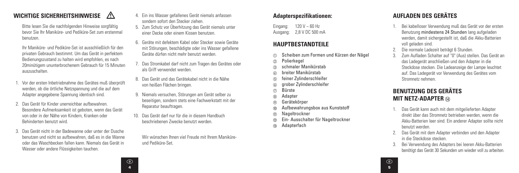 - Der mitgelieferte Adapter wurde speziell für die Benutzung mit dem Manikurre- und Pedikurre-Set entwickelt und darauf bei Beschädigung nur durch einen Originaladapter ersetzt werden.