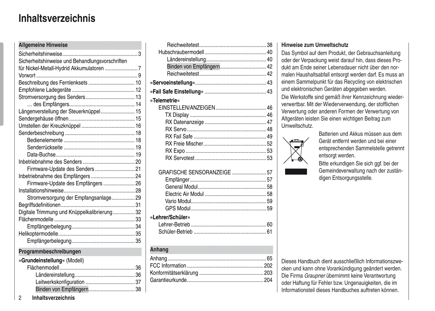 NiMH LiPo Description de l’émetteur 152 Eléments de commande 152 Dos de l’émetteur 153 Prise DATA 153 Mise en route de l’émetteur 154 Mise à jour de l‘émetteur 155 Mise en route du récepteur 158 Mise à jour du récepteur 160 Conseils d’implantation 162 Alimentation de la réception 163 Glossaire 165 Trims digitaux et calibrage des manches 166 Modèles à voilure fixe 167 Attribution des sorties récepteur 168 Hélicoptères 169 Attribution des sorties récepteur 169 Description des différents programmes « Réglages de base » (modèle) Modèles à voilure fixe 170 Réglage selon de pays 170 Configuration empennage 171 Procédure Binding pour récepteurs 172 Essai de portée 173 136 Sommaire Le symbole sur le produit, sur le mode d’emploi ou sur l’emballage, vous informe que ce matériel ne peut pas simplement être jeté en fin de vie. Il doit être confié à un centre de tri pour le recyclage des différents éléments électriques et électroniques. Conformément à leur marquage, la plupart des matériaux utilisés sont réutilisables pour d’autres applications Par cette action, vous participez activement à la protection de notre environnement. Les piles et accus doivent être enlevés de l’appareil et font l’objet d’un recyclage spécifique auprès de centres agrés. Renseignez-vous auprès de votre mairie ou des services compétents pour connaître les différents centres de ramassage et de recyclage.