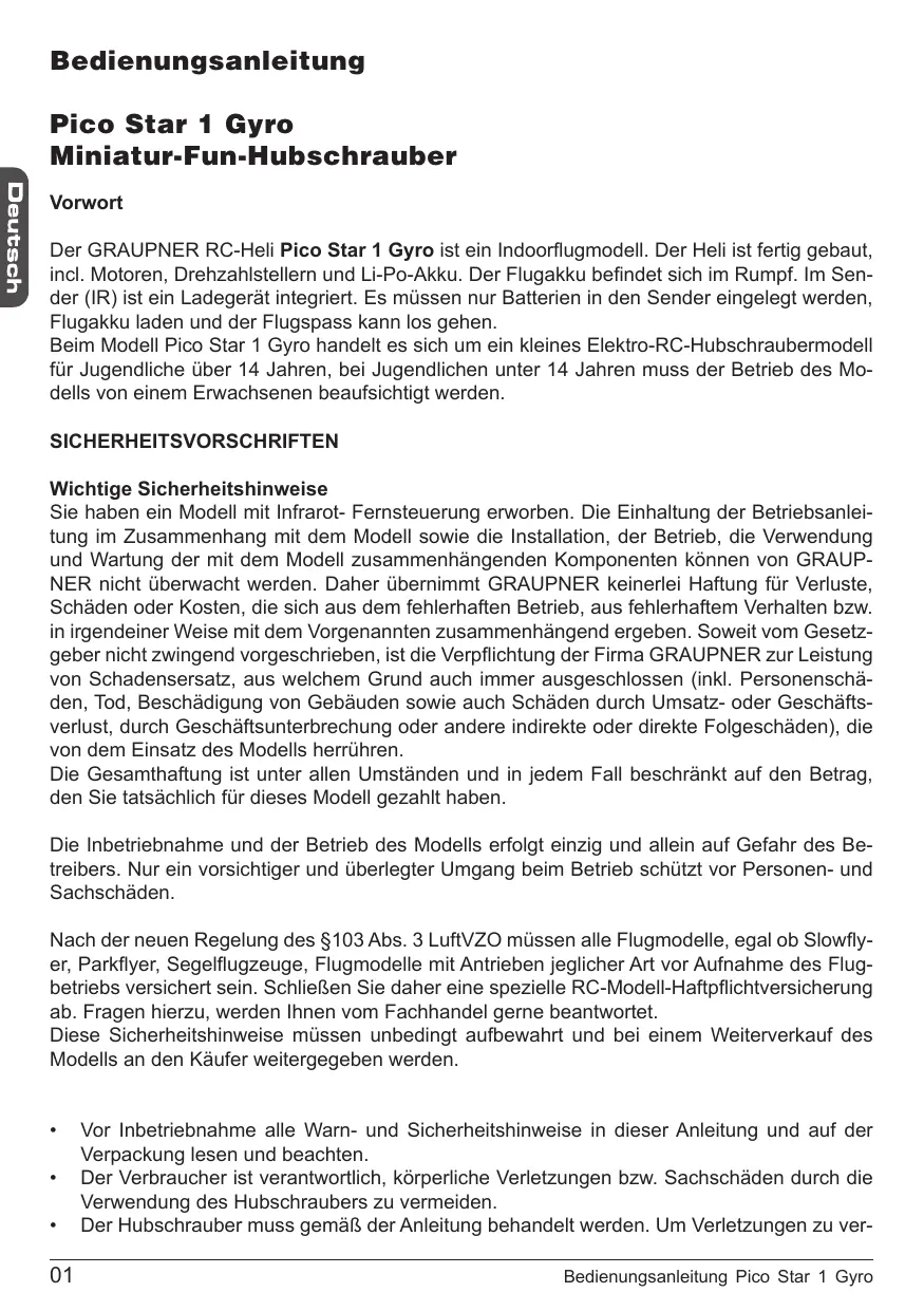 GRAUPNER GmbH & Co. KG - D-73230 KIRCHHEIM/TECK GERMANY Bedienungsanleitung Pico Star 1 Gyro Miniatur-Fun-Hubschrauber Vorwort Der GRAUPNER RC-Heli Pico Star 1 Gyro ist ein Indoorflugmodell. Der Heli ist fertig gebaut, incl. Motoren, Drehzahlstellern und Li-Po-Akku. Der Flugakku befindet sich im Rumpf. Im Sender (IR) ist ein Ladegerät integriert. Es müssen nur Batterien in den Sender eingelegt werden, Flugakku laden und der Flugspass kann los gehen. Beim Modell Pico Star 1 Gyro handelt es sich um ein kleines Elektro-RC-Hubschraubermodell für Jugendliche über 14 Jahren, bei Jugendlichen unter 14 Jahren muss der Betrieb des Modells von einem Erwachsenen beaufsichtigt werden. SICHERHEITSVORSCHRIFTEN Wichtige Sicherheitshinweise Sie haben ein Modell mit Infrarot- Fernsteuerung erworben. Die Einhaltung der Betriebsanleitung im Zusammenhang mit dem Modell sowie die Installation, der Betrieb, die Verwendung und Wartung der mit dem Modell zusammenhängenden Komponenten können von GRAUPNER nicht überwacht werden. Daher übernimmt GRAUPNER keinerlei Haftung für Verluste, Schäden oder Kosten, die sich aus dem fehlerhaften Betrieb, aus fehlerhaftem Verhalten bzw. in irgendeiner Weise mit dem Vorgenannten zusammenhängend ergeben. Soweit vom Gesetzgeber nicht zwingend vorgeschrieben, ist die Verpflichtung der Firma GRAUPNER zur Leistung von Schadensersatz, aus welchem Grund auch immer ausgeschlossen (inkl. Personenschäden, Tod, Beschädigung von Gebäuden sowie auch Schäden durch Umsatz- oder Geschäftsverlust, durch Geschäftsunterbrechung oder andere indirekte oder direkte Folgeschäden), die von dem Einsatz des Modells herrühren. Die Gesamthaftung ist unter allen Umständen und in jedem Fall beschränkt auf den Betrag, den Sie tatsächlich für dieses Modell gezahlt haben. Die Inbetriebnahme und der Betrieb des Modells erfolgt einzig und allein auf Gefahr des Betreibers. Nur ein vorsichtiger und überlegter Umgang beim Betrieb schützt vor Personen- und Sachschäden. Nach der neuen Regelung des §103 Abs. 3 LuftVZO müssen alle Flugmodelle, egal ob Slowflyer, Parkflyer, Segelflugzeuge, Flugmodelle mit Antrieben jeglicher Art vor Aufnahme des Flugbetriebs versichert sein. Schließen Sie daher eine spezielle RC-Modell-Haftpflichtversicherung ab. Fragen hierzu, werden Ihnen vom Fachhandel gerne beantwortet. Diese Sicherheitshinweise müssen unbedingt aufbewahrt und bei einem Weiterverkauf des Modells an den Käufer weitergegeben werden. • • •