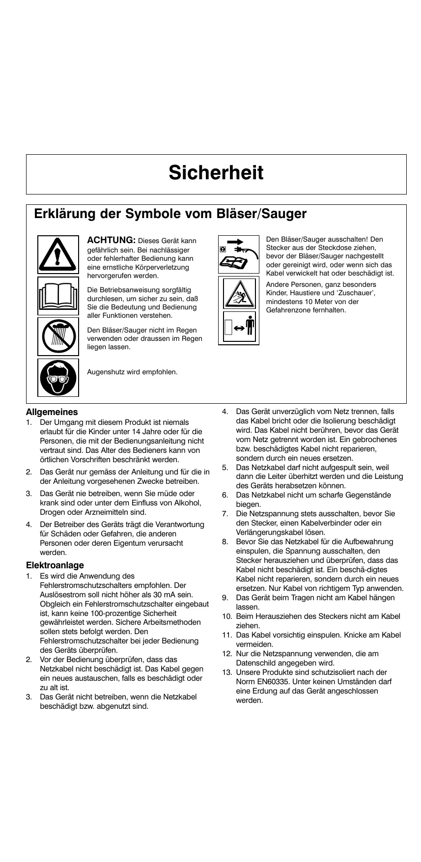 Je, soussigné M. Bowden, représentant d’Husqvarna Outdoor Products, Aycliffe Industrial Park, NEWTON AYCLIFFE, Co. Durham. DL5 6UP. certifie qu’un échantillon du produit mentionné ci--dessus a été soumis à des essais selon les instructions de la norme ISO 5349. La valeur moyenne quadratique pondérée maximale des vibrations enregistrées au niveau de la main de l’utilisateur était : Type Niveau de puissance acoustique garanti Niveau de puissance acoustique mesuré Niveau Valeur Circulation d’air nominal Poids Twister 2000 107 dB(A) 105 dB(A) 92 dB(A) 15 m/s2 0,167 m3/s 4,2 kg Newton Aycliffe, 13/06/2006 M. Bowden, Recherche et développement Directeur Sicherheit Erklärung der Symbole vom Bläser/Sauger ACHTUNG: Dieses Gerät kann gefährlich sein. Bei nachlässiger oder fehlerhafter Bedienung kann eine ernstliche Körperverletzung hervorgerufen werden. Die Betriebsanweisung sorgfältig durchlesen, um sicher zu sein, daß Sie die Bedeutung und Bedienung aller Funktionen verstehen. Den Bläser/Sauger ausschalten! Den Stecker aus der Steckdose ziehen, bevor der Bläser/Sauger nachgestellt oder gereinigt wird, oder wenn sich das Kabel verwickelt hat oder beschädigt ist. Andere Personen, ganz besonders Kinder, Haustiere und ‘Zuschauer’, mindestens 10 Meter von der Gefahrenzone fernhalten. Den Bläser/Sauger nicht im Regen verwenden oder draussen im Regen liegen lassen. Augenshutz wird empfohlen. Allgemeines