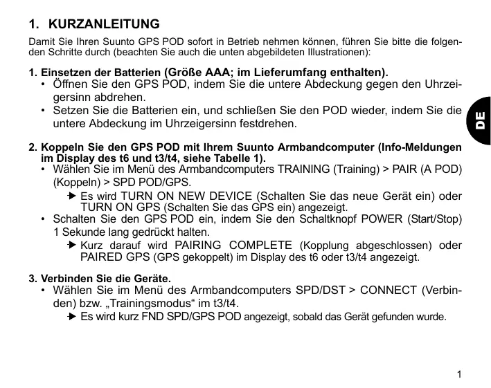 Damit Sie Ihren Suunto GPS POD sofort in Betrieb nehmen können, führen Sie bitte die folgenden Schritte durch (beachten Sie auch die unten abgebildeten Illustrationen):