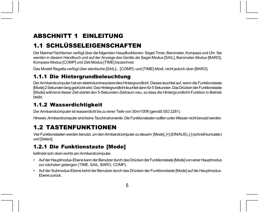 Der Mariner/Yachtsman verfügt über die folgenden Hauptfunktionen: Segel-Timer, Barometer, Kompass und Uhr. Sie werden in diesem Handbuch und auf der Anzeige des Geräts als Segel-Modus [SAIL], Barometer-Modus [BARO], Kompass-Modus [COMP] und Zeit-Modus [TIME] bezeichnet. Das Modell Regatta verfügt über identische [SAIL]-, [COMP]- und [TIME]-Modi, nicht jedoch über [BARO].