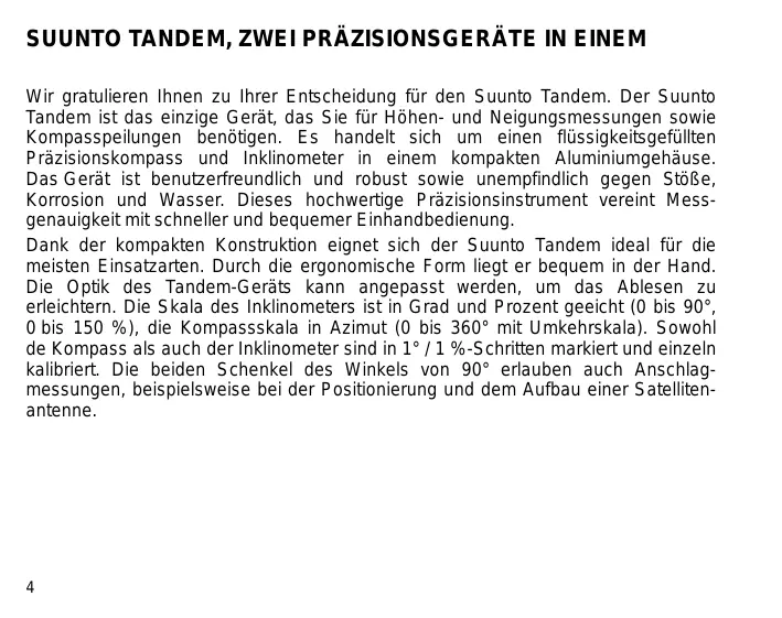 SUUNTO TANDEM, ZWEI PRÄZISIONSGERÄTE IN EINEM Wir gratulieren Ihnen zu Ihrer Entscheidung für den Suunto Tandem. Der Suunto Tandem ist das einzige Gerät, das Sie für Höhen- und Neigungsmessungen sowie Kompasspeilungen benötigen. Es handelt sich um einen flüssigkeitsgefüllten Präzisionskompass und Inklinometer in einem kompakten Aluminiumgehäuse. Das Gerät ist benutzerfreundlich und robust sowie unempfindlich gegen Stöße, Korrosion und Wasser. Dieses hochwertige Präzisionsinstrument vereint Messgenauigkeit mit schneller und bequemer Einhandbedienung. Dank der kompakten Konstruktion eignet sich der Suunto Tandem ideal für die meisten Einsatzarten. Durch die ergonomische Form liegt er bequem in der Hand. Die Optik des Tandem-Geräts kann angepasst werden, um das Ablesen zu erleichtern. Die Skala des Inklinometers ist in Grad und Prozent geeicht (0 bis 90°, 0 bis 150 %), die Kompassskala in Azimut (0 bis 360° mit Umkehrskala). Sowohl de Kompass als auch der Inklinometer sind in 1° / 1 %-Schritten markiert und einzeln kalibriert. Die beiden Schenkel des Winkels von 90° erlauben auch Anschlagmessungen, beispielsweise bei der Positionierung und dem Aufbau einer Satellitenantenne.