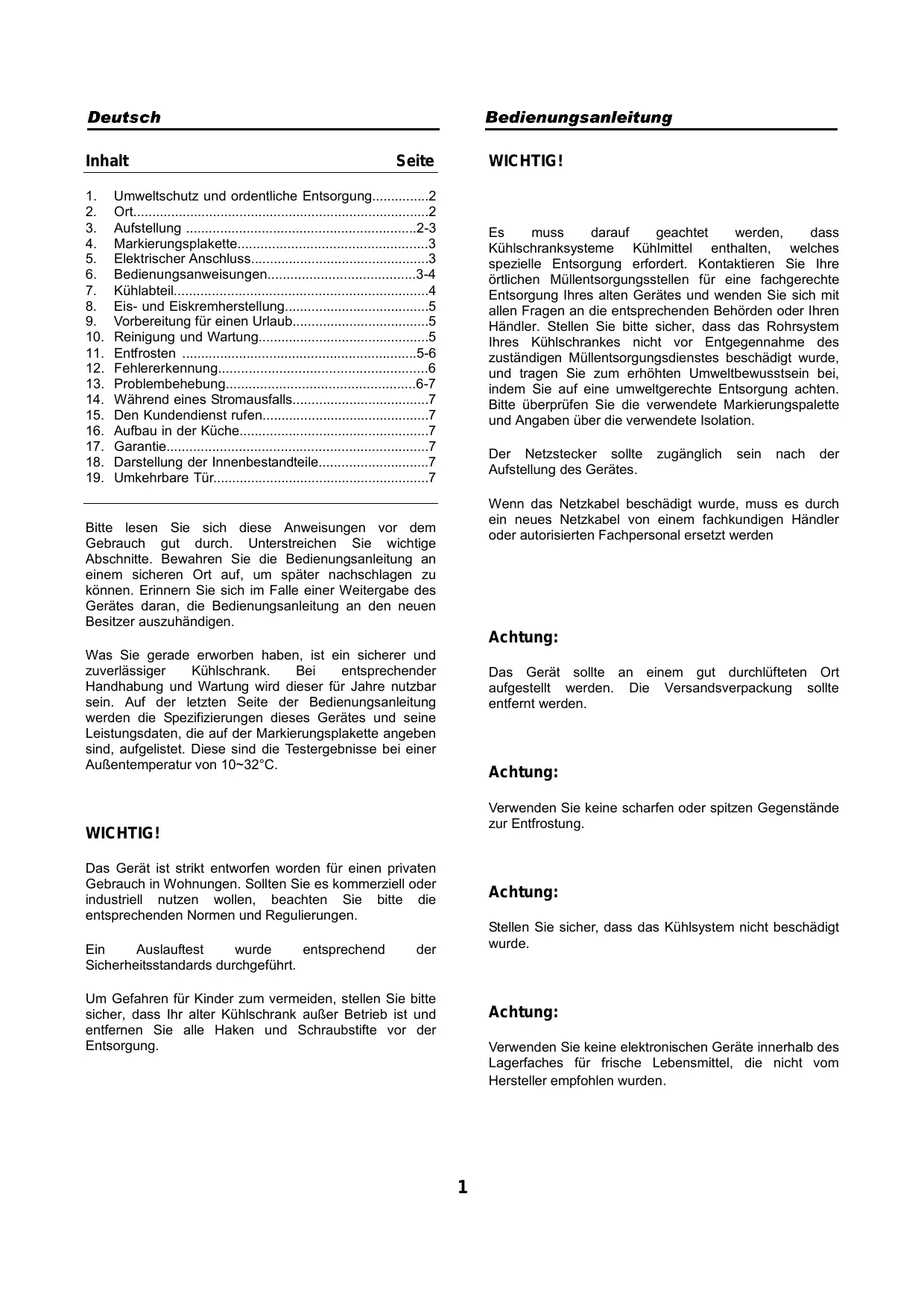 muss darauf geachtet werden, dass Kühlschranksysteme Kühlmittel enthalten, welches spezielle Entsorgung erfordert. Kontaktieren Sie Ihre örtlichen Müllentsorgungsstellen für eine fachgerechte Entsorgung Ihres alten Gerätes und wenden Sie sich mit allen Fragen an die entsprechenden Behörden oder Ihren Händler. Stellen Sie bitte sicher, dass das Rohrsystem Ihres Kühlschrankes nicht vor Entgegennahme des zuständigen Müllentsorgungsdienstes beschädigt wurde, und tragen Sie zum erhöhten Umweltbewusstsein bei, indem Sie auf eine umweltgerechte Entsorgung achten. Bitte überprüfen Sie die verwendete Markierungspalette und Angaben über die verwendete Isolation. Der Netzstecker sollte Aufstellung des Gerätes. zugänglich sein nach der Wenn das Netzkabel beschädigt wurde, muss es durch ein neues Netzkabel von einem fachkundigen Händler oder autorisierten Fachpersonal ersetzt werden Bitte lesen Sie sich diese Anweisungen vor dem Gebrauch gut durch. Unterstreichen Sie wichtige Abschnitte. Bewahren Sie die Bedienungsanleitung an einem sicheren Ort auf, um später nachschlagen zu können. Erinnern Sie sich im Falle einer Weitergabe des Gerätes daran, die Bedienungsanleitung an den neuen Besitzer auszuhändigen. Achtung: Was Sie gerade erworben haben, ist ein sicherer und zuverlässiger Kühlschrank. Bei entsprechender Handhabung und Wartung wird dieser für Jahre nutzbar sein. Auf der letzten Seite der Bedienungsanleitung werden die Spezifizierungen dieses Gerätes und seine Leistungsdaten, die auf der Markierungsplakette angeben sind, aufgelistet. Diese sind die Testergebnisse bei einer Außentemperatur von 10~32°C. Das Gerät sollte an einem gut durchlüfteten Ort aufgestellt werden. Die Versandsverpackung sollte entfernt werden. Achtung: Verwenden Sie keine scharfen oder spitzen Gegenstände zur Entfrostung. WICHTIG! Das Gerät ist strikt entworfen worden für einen privaten Gebrauch in Wohnungen. Sollten Sie es kommerziell oder industriell nutzen wollen, beachten Sie bitte die entsprechenden Normen und Regulierungen. Ein Auslauftest wurde entsprechend Sicherheitsstandards durchgeführt. Achtung: Stellen Sie sicher, dass das Kühlsystem nicht beschädigt wurde. der Um Gefahren für Kinder zum vermeiden, stellen Sie bitte sicher, dass Ihr alter Kühlschrank außer Betrieb ist und entfernen Sie alle Haken und Schraubstifte vor der Entsorgung. Achtung: Verwenden Sie keine elektronischen Geräte innerhalb des Lagerfaches für frische Lebensmittel, die nicht vom Hersteller empfohlen wurden.