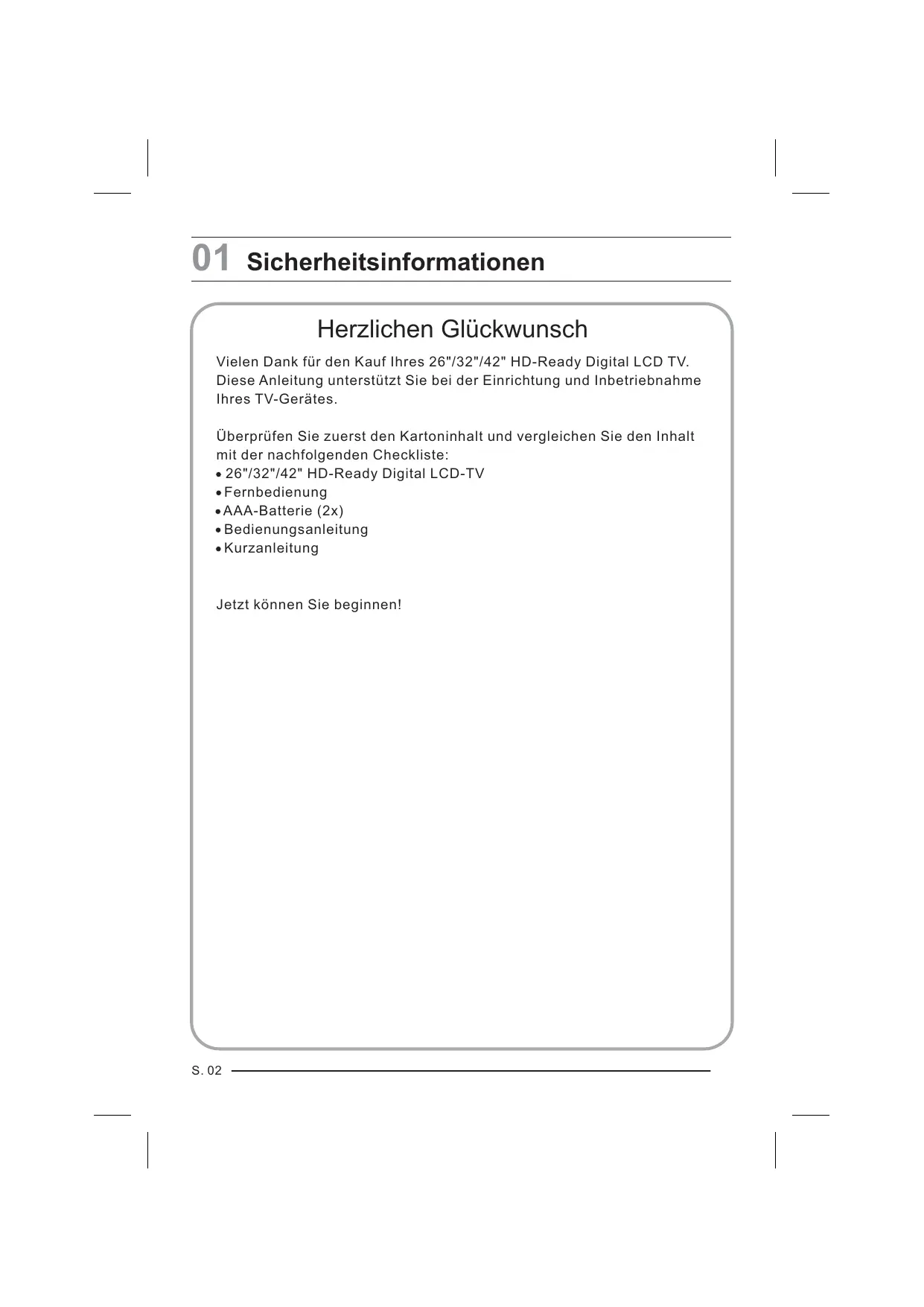 Sicherheitsinformationen Herzlichen Glückwunsch Vielen Dank für den Kauf Ihres 26"/32"/42" HD-Ready Digital LCD TV. Diese Anleitung unterstützt Sie bei der Einrichtung und Inbetriebnahme Ihres TV-Gerätes . Überprüfen Sie zuerst den Kartoninhalt und vergleichen Sie den Inhalt mit der nachfolgenden Checkliste: 26"/32"/42" HD-Ready Digital LCD-TV Fernbedienung AAA-Batterie (2x) Bedienungsanleitung Kurzanleitung Jetzt können Sie beginnen! S. 02 WICHTIGE INFORMATIONEN WARNUNG STROMSCHLAGGEFAHR NICHT ÖFFNEN WARNUNG ÖFFNEN SIE WEDER DAS GEHÄUSE NOCH DIE RÜCKSEITE DES GERÄTES, UM DIE GEFAHR EINES STROMSCHLAGS ZU MINIMIEREN. DIE INNENLIEGENDEN BAUTEILE KÖNNEN NICHT SELBST GEWARTET WERDEN. WENDEN SIE SICH HIERFÜR AN QUALIFIZIERTES SERVICEPERSONAL. 01 Sicherheitsinformationen *Um die Gefahr eines Stromschlags auszuschließen, wird dringend von der Öffnung der Geräterückseite abgeraten, da sich dahinter keine bedienungsrelevanten Bauteile befinden. *Falls erforderlich, wenden Sie sich bitte an autorisiertes Kundendienstpersonal. *Blitz-Symbol innerhalb eines Dreiecks: Potenziell gefährliche Situation, deren Eintreten zu schweren Verletzungen durch Hochspannung führen kann. *Ausrufezeichen innerhalb eines Dreiecks: Wichtiges Bauteil oder Zubehörteil, dessen technische Spezifikationen bei Austausch genau eingehalten werden müssen. Warnung: TV-Gerät unter keinen Umständen an Orten mit hoher Luftfeuchtigkeit einsetzen, um Brand- oder elektrische Gefahren zu vermeiden. Achten Sie darauf, den Bildschirm nicht versehentlich zu verkratzen oder Stößen auszusetzen. Vorsicht: Lesen Sie diese Bedienungsanleitung vor der ersten Verwendung Ihres TV-Gerätes bitte sorgfältig durch und bewahren Sie sie für zukünftiges Nachschlagen an einem sicheren Ort auf. Lesen Sie diese Bedienungsanleitung sorgfältig durch, um Ihr TV-Gerät bestmöglich nutzen zu können, und bewahren Sie sie für zukünftiges Nachschlagen auf. Die in der Bedienungsanleitung dargestellten Bildschirmanzeigen und Zahlen können sich aufgrund technischer Innovationen verändern. Vorsicht: Die unbefugte Demontage dieses Produkts ist nicht gestattet. S. 03 Das Produkt muss gut befestigt sein, um Sturz- oder Brandschäden zu vermeiden. Betreiben Sie dieses Produkt nicht unter direkter Sonneneinstrahlung oder in unmittelbarer Nähe von Wärmequellen, um Brandgefahren zu vermeiden. Platzieren Sie das Produkt nicht in der Nähe von Wasser oder Öl, um Brandgefahren zu vermeiden. Unterbrechen Sie bei Regen- und insbesondere bei Gewitterstürmen Stromversorgung und Antennenanschluss. Verwenden Sie keine beschädigten Netzstecker und verlegen Sie das Netzkabel in ausreichender Entfernung zu Wärmequellen, um Stromschläge oder Brandgefahren zu vermeiden. Schalten Sie nur eine geringe Anzahl von Steckdosen parallel und verwenden Sie keine Mehrfachsteckdosen, um Brandgefahren zu vermeiden. Das Produkt muss auf einer festen und stabilen Oberfläche stehen, um Sturzgefahr zu vermeiden. Die unbefugte Demontage des TV-Geräts ist nicht gestattet, um Stromschläge und Brandgefahren zu vermeiden. Wenden Sie sich an autorisiertes Kundendienstpersonal, falls Sie technische Unterstützung benötigen. Platzieren Sie das Produkt nicht in der Nähe von Transformatoren oder Wärmequellen, um Brandgefahren zu vermeiden. Unterbrechen Sie die Stromversorgung und wenden Sie sich an autorisiertes Kundendienstpersonal, falls Sie ungewöhnliche Geräusche im Produkt wahrnehmen. S. 04 Platzieren Sie das Produkt nicht an Orten mit hoher Luftfeuchtigkeit, um Brandgefahren zu vermeiden. Die Antenne des Produkts sollte sich nicht in der Nähe elektrischer Leitungen befinden, um Stromschläge zu vermeiden. Berühren Sie den Stecker nie mit feuchten oder nassen Händen, da dies einen Stromschlag auslösen könnte. Stellen Sie sicher, dass der Netzstecker des TV-Gerätes vollständig eingesteckt ist, da eine schlechte elektrische Verbindung eine Brandgefahr darstellt. 01 Sicherheitsinformationen Verwenden oder lagern Sie keine leicht entflammbaren Materialien in der Nähe des Produkts, um Explosionsoder Brandgefahren zu vermeiden. Wird eine Antenne verwendet, muss sichergestellt sein, dass entlang des Kabels kein Wasser in das TV-Gerät gelangen kann. Trennen Sie das TV-Gerät vom Netz und verwenden Sie ein weiches Tuch ohne Chemikalien, um das Produkt zu reinigen. Stellen Sie sicher, dass kein Wasser in das Produkt gelangt. Netzstecker und Netzkabel müssen sauber gehalten werden, um Stromschläge und Brandgefahren zu vermeiden. Unterbrechen Sie bei Regen- und Gewitterstürmen Stromversorgung und Antennenanschluss, um Stromschläge und Brandgefahren zu vermeiden. Trennen Sie bei längerer Abwesenheit das TV-Gerät vom Netz, um Stromschläge und Brandgefahren zu vermeiden. S. 05