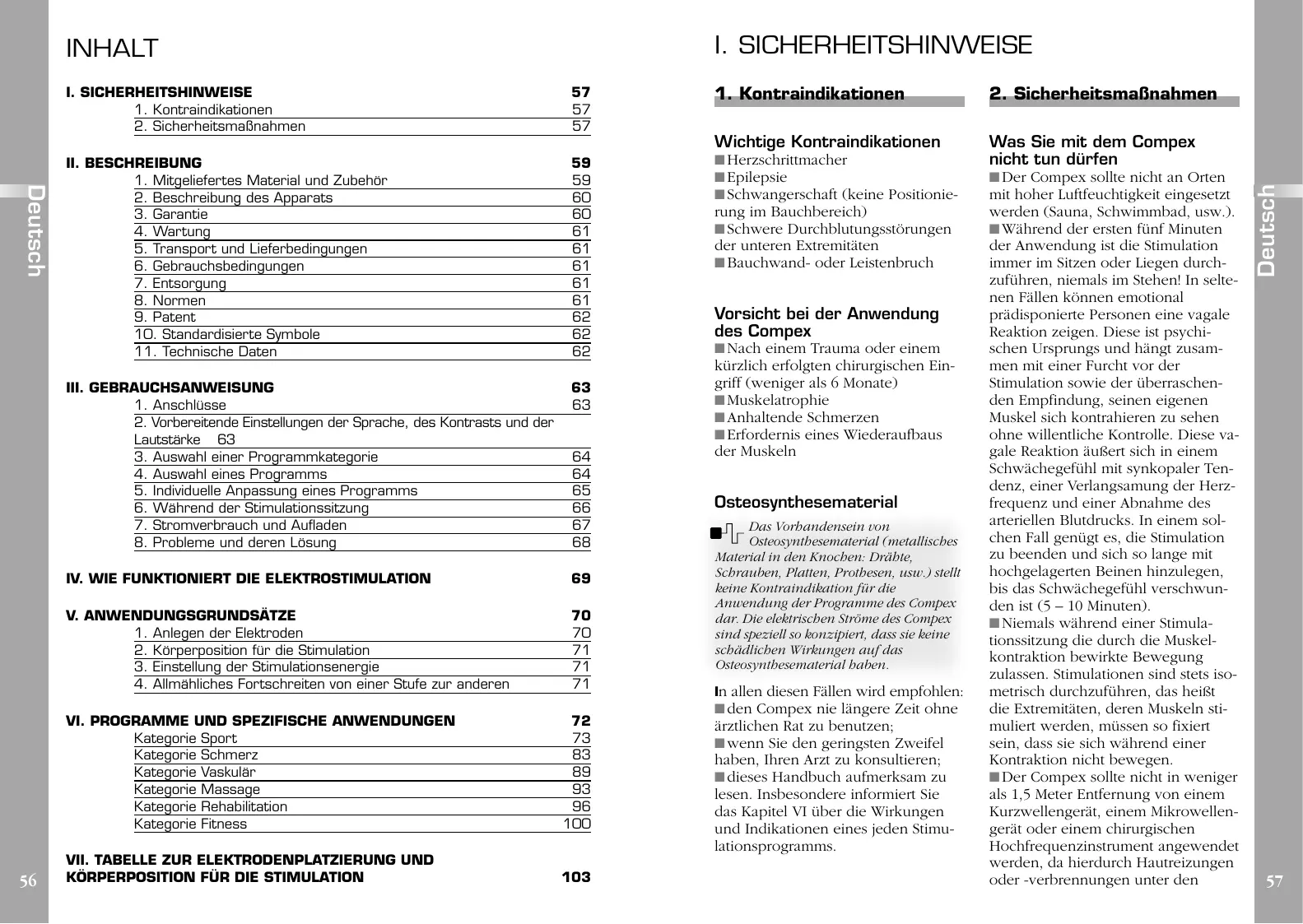 allen diesen Fällen wird empfohlen: ■ den Compex nie längere Zeit ohne ärztlichen Rat zu benutzen; ■ wenn Sie den geringsten Zweifel haben, Ihren Arzt zu konsultieren; ■ dieses Handbuch aufmerksam zu lesen. Insbesondere informiert Sie das Kapitel VI über die Wirkungen und Indikationen eines jeden Stimulationsprogramms. ■ Der Compex sollte nicht an Orten mit hoher Luftfeuchtigkeit eingesetzt werden (Sauna, Schwimmbad, usw.). ■ Während der ersten fünf Minuten der Anwendung ist die Stimulation immer im Sitzen oder Liegen durchzuführen, niemals im Stehen! In seltenen Fällen können emotional prädisponierte Personen eine vagale Reaktion zeigen. Diese ist psychischen Ursprungs und hängt zusammen mit einer Furcht vor der Stimulation sowie der überraschenden Empfindung, seinen eigenen Muskel sich kontrahieren zu sehen ohne willentliche Kontrolle. Diese vagale Reaktion äußert sich in einem Schwächegefühl mit synkopaler Tendenz, einer Verlangsamung der Herzfrequenz und einer Abnahme des arteriellen Blutdrucks. In einem solchen Fall genügt es, die Stimulation zu beenden und sich so lange mit hochgelagerten Beinen hinzulegen, bis das Schwächegefühl verschwunden ist (5 – 10 Minuten). ■ Niemals während einer Stimulationssitzung die durch die Muskelkontraktion bewirkte Bewegung zulassen. Stimulationen sind stets isometrisch durchzuführen, das heißt die Extremitäten, deren Muskeln stimuliert werden, müssen so fixiert sein, dass sie sich während einer Kontraktion nicht bewegen. ■ Der Compex sollte nicht in weniger als 1,5 Meter Entfernung von einem Kurzwellengerät, einem Mikrowellengerät oder einem chirurgischen Hochfrequenzinstrument angewendet werden, da hierdurch Hautreizungen oder -verbrennungen unter den Deutsch