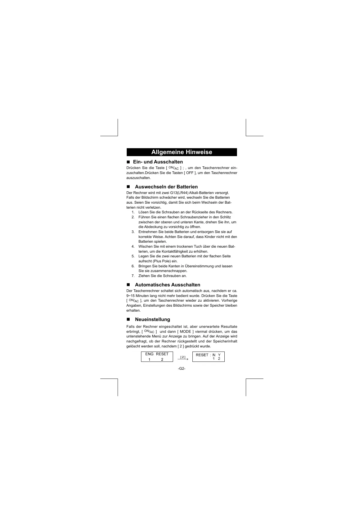 , x2, x3, xy )......................... 14 Standardderivationsrechnung .................................................... 14 Regressionsrechnung.................................................................. 14 -G1- Allgemeine Hinweise Ein- und Ausschalten Drücken Sie die Taste [ ON/AC ] ; , um den Taschenrechner einzuschalten.Drücken Sie die Tasten [ OFF ], um den Taschenrechner auszuschalten. Auswechseln der Batterien Der Rechner wird mit zwei G13(LR44) Alkali-Batterien versorgt. Falls der Bildschirm schwächer wird, wechseln Sie die Batterien aus. Seien Sie vorsichtig, damit Sie sich beim Wechseln der Batterien nicht verletzen.