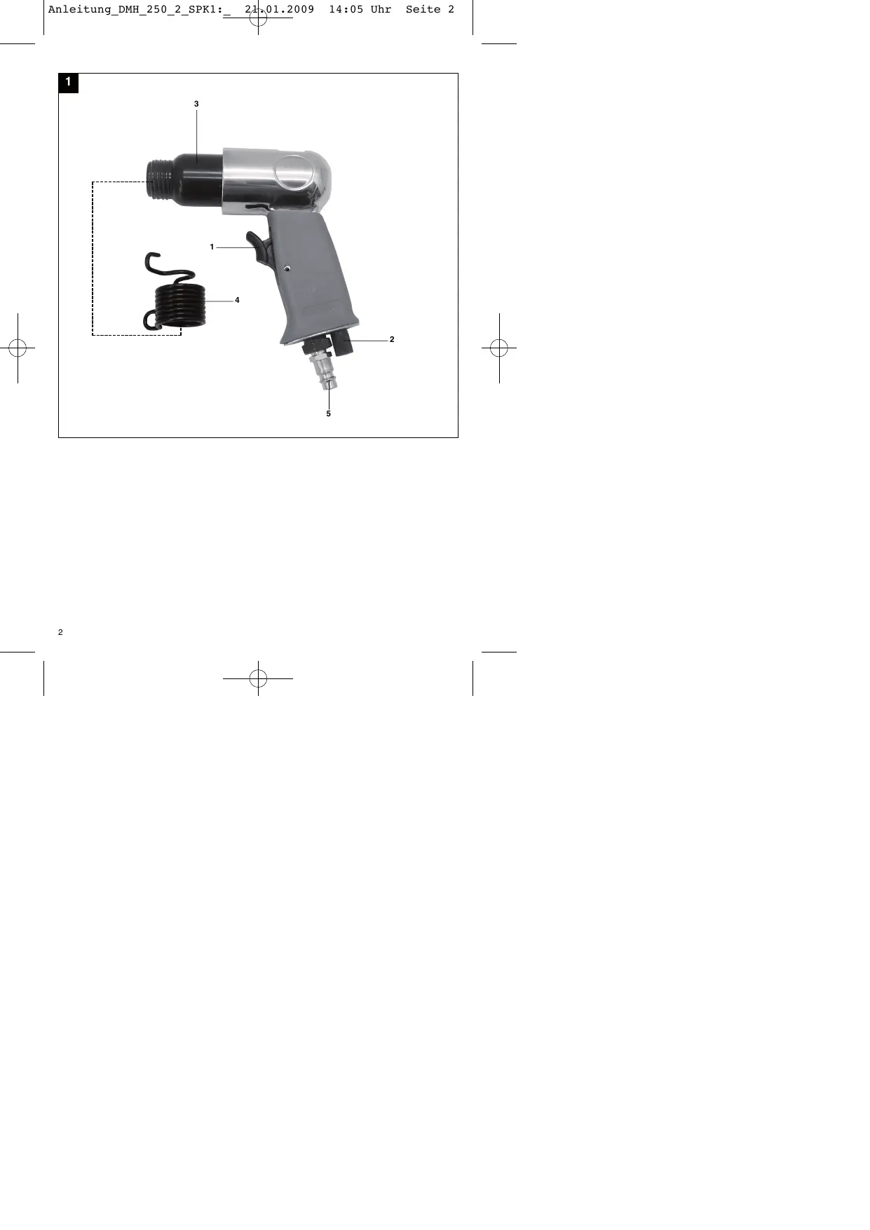 Vissez le raccord enfichable fourni dans le raccord d'air après avoir enroulé le filetage de 2 à 8 couches de bande d'étanchéité. Insérez le burin désiré dans la prise à six pans du marteau-burineur. Mettez le ressort tendeur sur le burin. Vissez le ressort tendeur sur le filetage du cylindre jusqu'à la butée. En même temps, maintenez le ressort tendeur par l'étrier de retenue avant. Raccordez le marteau-burineur à un compresseur ou à un réseau d'air comprimé à puissance suffisante. Utlisez à cet effet un tuyau d'air comprimé flexible (0 10 mm à l'intérieur) avec raccord de fermeture rapide. Veillez à ce que la vis de réglage d'air (2) soit ouverte. Avancez le marteau- burineur vers l'objet à travailler. En actionnant la gâchette (1) le marteau-burineur se met en marche.