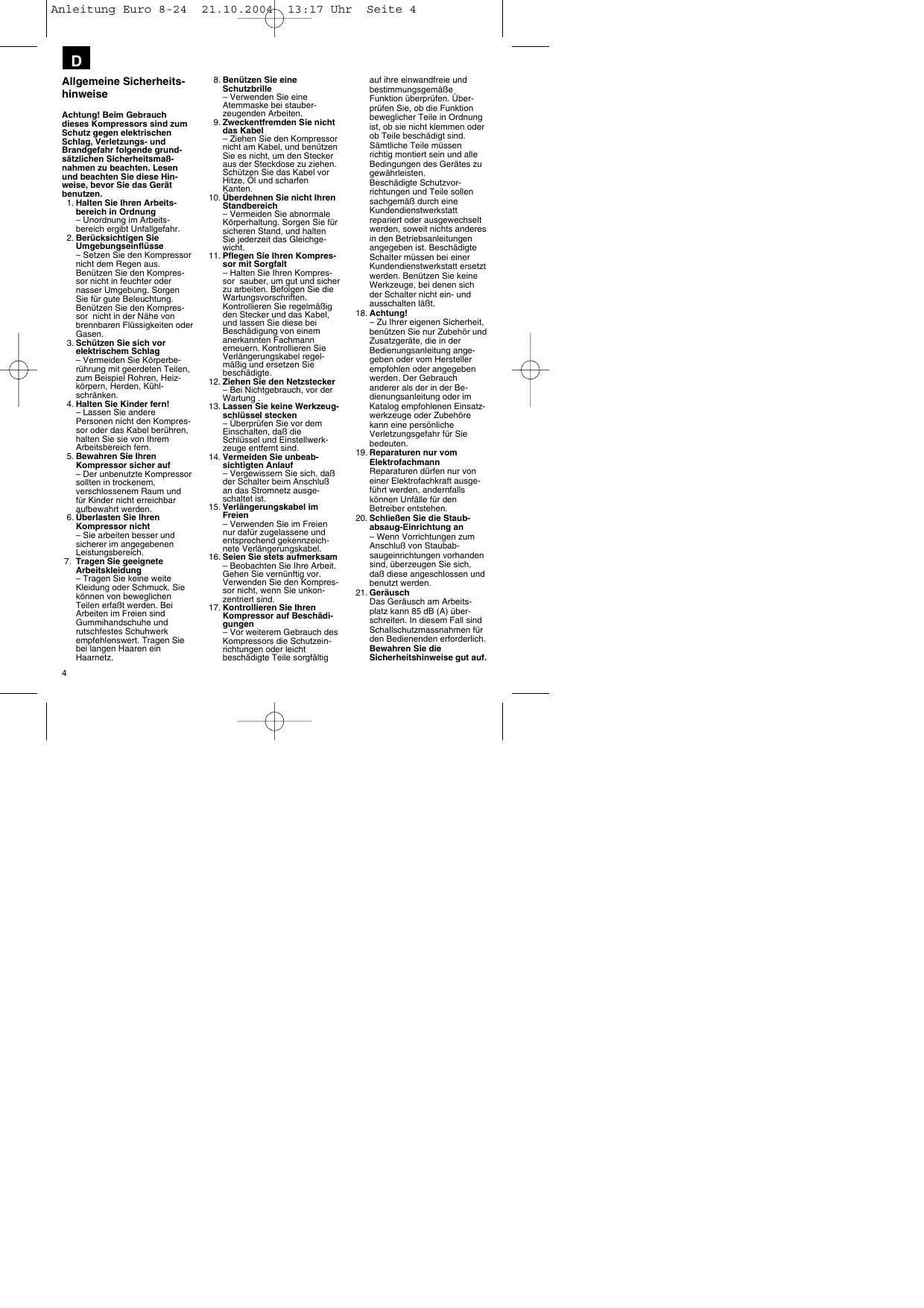 D Allgemeine Sicherheitshinweise Achtung! Beim Gebrauch dieses Kompressors sind zum Schutz gegen elektrischen Schlag, Verletzungs- und Brandgefahr folgende grundsätzlichen Sicherheitsmaßnahmen zu beachten. Lesen und beachten Sie diese Hinweise, bevor Sie das Gerät benutzen. 1. Halten Sie Ihren Arbeitsbereich in Ordnung – Unordnung im Arbeitsbereich ergibt Unfallgefahr. 2. Berücksichtigen Sie Umgebungseinflüsse – Setzen Sie den Kompressor nicht dem Regen aus. Benützen Sie den Kompressor nicht in feuchter oder nasser Umgebung. Sorgen Sie für gute Beleuchtung. Benützen Sie den Kompressor nicht in der Nähe von brennbaren Flüssigkeiten oder Gasen. 3. Schützen Sie sich vor elektrischem Schlag – Vermeiden Sie Körperberührung mit geerdeten Teilen, zum Beispiel Rohren, Heizkörpern, Herden, Kühlschränken. 4. Halten Sie Kinder fern! – Lassen Sie andere Personen nicht den Kompressor oder das Kabel berühren, halten Sie sie von Ihrem Arbeitsbereich fern. 5. Bewahren Sie Ihren Kompressor sicher auf – Der unbenutzte Kompressor sollten in trockenem, verschlossenem Raum und für Kinder nicht erreichbar aufbewahrt werden. 6. Überlasten Sie Ihren Kompressor nicht – Sie arbeiten besser und sicherer im angegebenen Leistungsbereich. 7. Tragen Sie geeignete Arbeitskleidung – Tragen Sie keine weite Kleidung oder Schmuck. Sie können von beweglichen Teilen erfaßt werden. Bei Arbeiten im Freien sind Gummihandschuhe und rutschfestes Schuhwerk empfehlenswert. Tragen Sie bei langen Haaren ein Haarnetz. 4