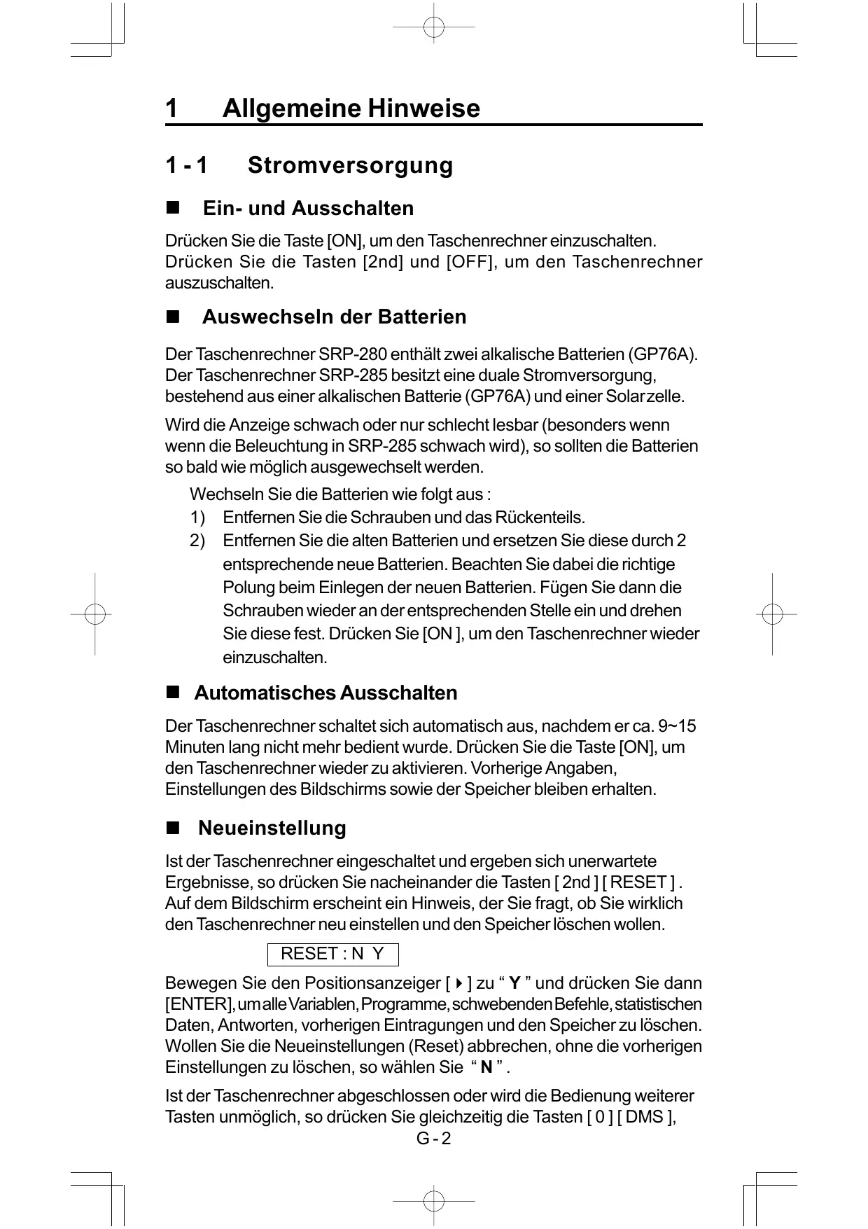 entsprechende neue Batterien. Beachten Sie dabei die richtige Polung beim Einlegen der neuen Batterien. Fügen Sie dann die Schrauben wieder an der entsprechenden Stelle ein und drehen Sie diese fest. Drücken Sie [ON ], um den Taschenrechner wieder einzuschalten. Automatisches Ausschalten Der Taschenrechner schaltet sich automatisch aus, nachdem er ca. 9~15 Minuten lang nicht mehr bedient wurde. Drücken Sie die Taste [ON], um den Taschenrechner wieder zu aktivieren. Vorherige Angaben, Einstellungen des Bildschirms sowie der Speicher bleiben erhalten. Neueinstellung Ist der Taschenrechner eingeschaltet und ergeben sich unerwartete Ergebnisse, so drücken Sie nacheinander die Tasten [ 2nd ] [ RESET ] . Auf dem Bildschirm erscheint ein Hinweis, der Sie fragt, ob Sie wirklich den Taschenrechner neu einstellen und den Speicher löschen wollen.