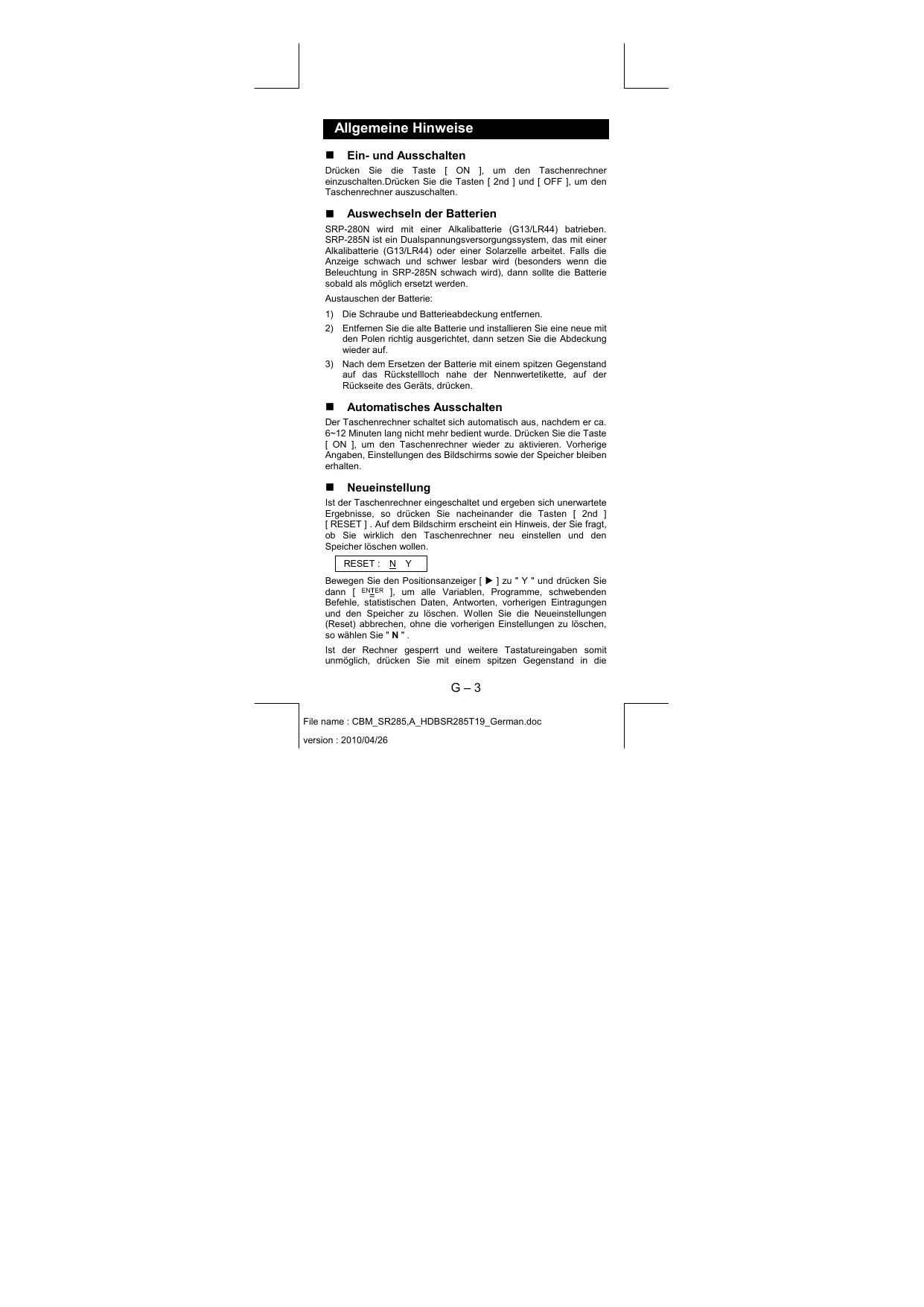 Neueinstellung Ist der Taschenrechner eingeschaltet und ergeben sich unerwartete Ergebnisse, so drücken Sie nacheinander die Tasten [ 2nd ] [ RESET ] . Auf dem Bildschirm erscheint ein Hinweis, der Sie fragt, ob Sie wirklich den Taschenrechner neu einstellen und den Speicher löschen wollen. RESET : N Y Bewegen Sie den Positionsanzeiger [ ] zu " Y " und drücken Sie dann [ ], um alle Variablen, Programme, schwebenden Befehle, statistischen Daten, Antworten, vorherigen Eintragungen und den Speicher zu löschen. Wollen Sie die Neueinstellungen (Reset) abbrechen, ohne die vorherigen Einstellungen zu löschen, so wählen Sie " N " . Ist der Rechner gesperrt und weitere Tastatureingaben somit unmöglich, drücken Sie mit einem spitzen Gegenstand in die G–3 File name : CBM_SR285,A_HDBSR285T19_German.doc version : 2010/04/26 Rückstellungsöffnung, um diesen Zustand aufzuheben. Alle Einstellungen werden auf die Standardeinstellungen zurückgestellt.