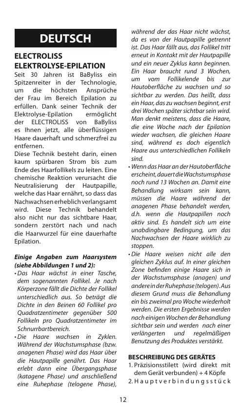 - Die Haare weisen nicht alle den gleichen Zyklus auf. In einer gleichen Zone befinden einige Haare sich in der Wachstumsphase (anagen) und andere in der Ruhephase (telogen). Aus diesem Grund muss die Behandlung ein bis zweimal pro Woche wiederholt werden. Die ersten Ergebnisse werden nach einigen Wochen der Behandlung sichtbar sein und werden nach einer verlängerten und regelmäßigen Benutzung des Produktes verstärkt. DEUTSCH ELECTROLISS ELEKTROLYSE-EPILATION Seit 30 Jahren ist BaByliss ein Spitzenreiter in der Technologie, um die höchsten Ansprüche der Frau im Bereich Epilation zu erfüllen. Dank seiner Technik der Elektrolyse-Epilation ermöglicht der ELECTROLISS von BaByliss es Ihnen jetzt, alle überflüssigen Haare dauerhaft und schmerzfrei zu entfernen. Diese Technik besteht darin, einen kaum spürbaren Strom bis zum Ende des Haarfollikels zu leiten. Eine chemische Reaktion verursacht die Neutralisierung der Hautpapille, welche das Haar ernährt, so dass das Nachwachsen erheblich verlangsamt wird. Diese Technik behandelt also nicht nur das sichtbare Haar, sondern zerstört nach und nach die Haarwurzel für eine dauerhafte Epilation. Einige Angaben zum Haarsystem (siehe Abbildungen 1 und 2):