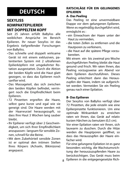 RATSCHLÄGE FÜR EIN GELUNGENES EPILIEREN A- Das Peeling Das Peeling ist eine unvermeidbare Etappe vor dem gelungenen Epilieren. Wenn es regelmäßig durchgeführt wird, ermöglicht es : • ein Einwachsen der Haare unter der Haut zu vermeiden, • die toten Zellen zu entfernen und die Hautporen zu verfeinern, • die Haut auf die spätere Pflege vorzubereiten. Mit einem ein- bis zweimal pro Woche durchgeführten Peeling bleibt die Haut gesund und frisch. Wir raten Ihnen, das Peeling vorzugsweise am Abend vor dem Epilieren durchzuführen. Dieses Peeling erleichtert dann das Herauszupfen der Haare, indem sie aufgerichtet werden. Vermeiden Sie ein Peeling genau nach einer Epilation. B- Das Epilieren Der Sexyliss von BaByliss verfügt über 72 Pinzetten, die jede einzeln wie eine Epilierpinzette funktionieren. Um eine optimale Wirksamkeit zu erreichen raten wir Ihnen, das Gerät auf relativ kurzen Härchen zu benutzen (0,5 cm). Vor einer Epilation raten wir Ihnen, sich lauwarm zu duschen. Durch die Hitze werden die Hauptporen geöffnet, so dass das Herauszupfen der Haare einfacher wird. Für eine gelungene Epilation ist es ganz besonders wichtig, die Wachstumsrichtung der herauszuzupfenden Haare zu berücksichtigen. Das Gerät muss beim Epilieren in die entgegengesetzte Rich-
